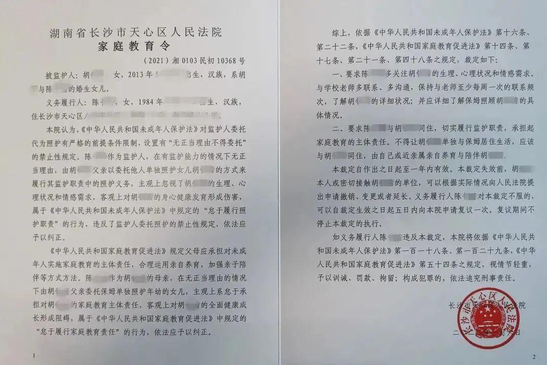 1月6日,长沙市天心区人民法院审理了一起抚养权变更纠纷案,针对监护人监护失职的情况,发出了《家庭教育令》。