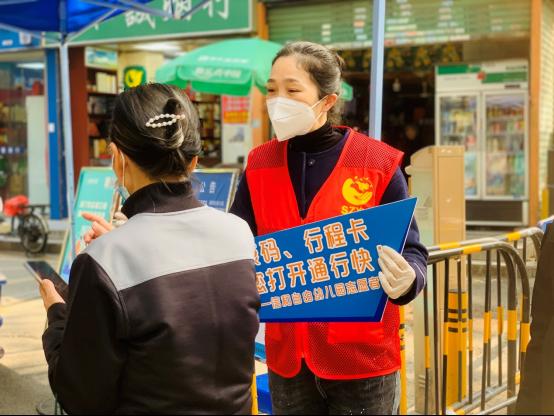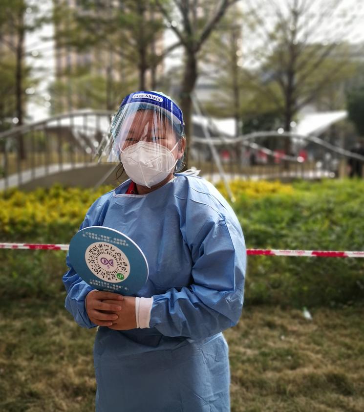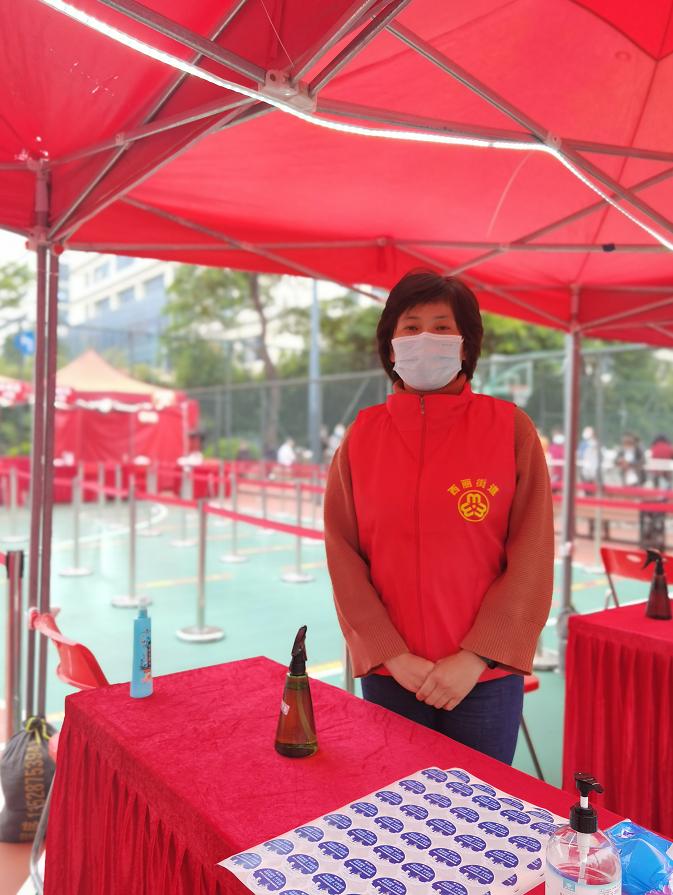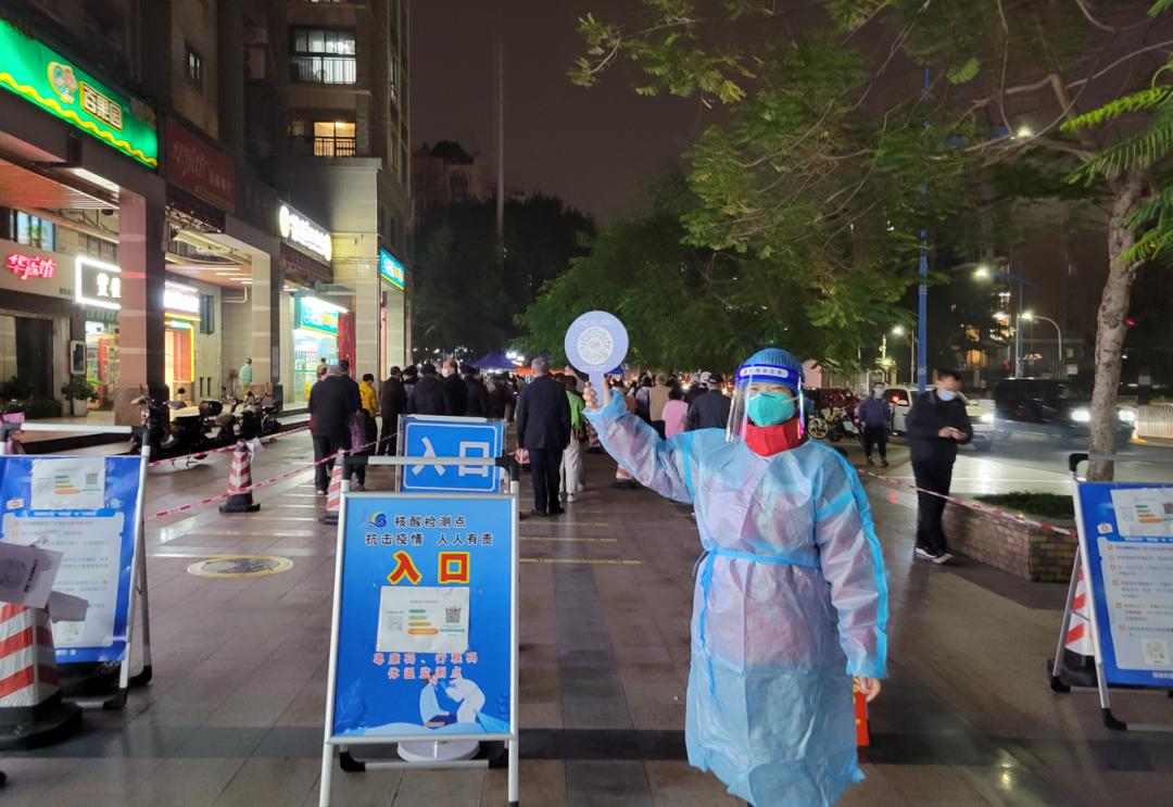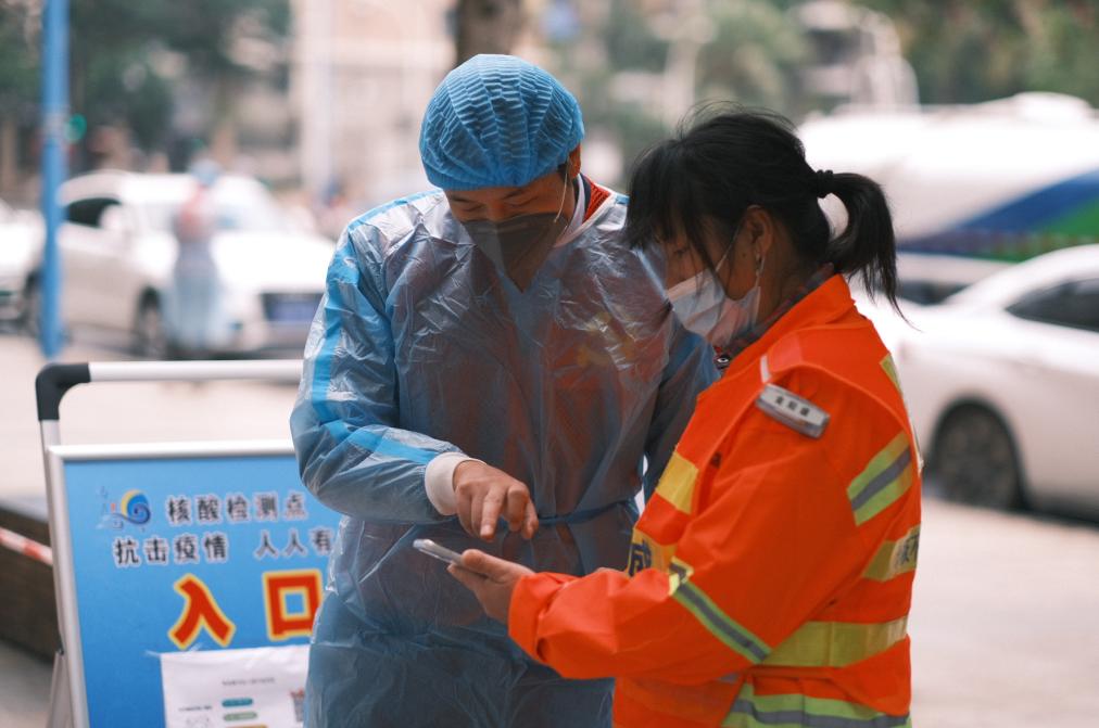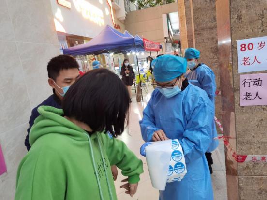 蔚蓝海岸东区幼儿园党员教师彭田梅负责给已完成核酸检测的人员发放“已检测”贴纸。这项工作简单,却是核酸检测中的必要环节。