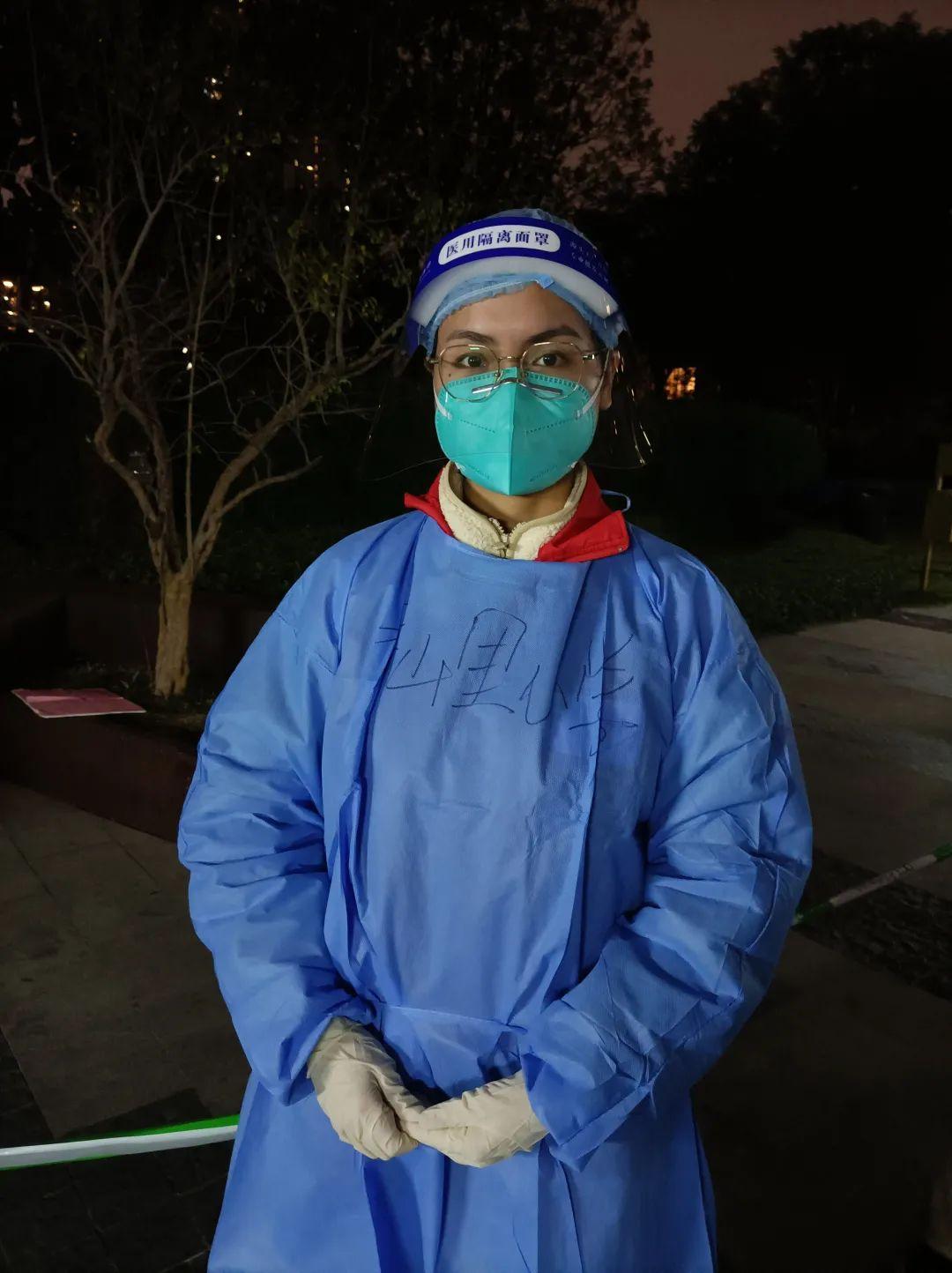 育才四小郭彩虹老师不但自己做了志愿者,还动员自己的女儿一起穿上防护服,为周边居民服务。