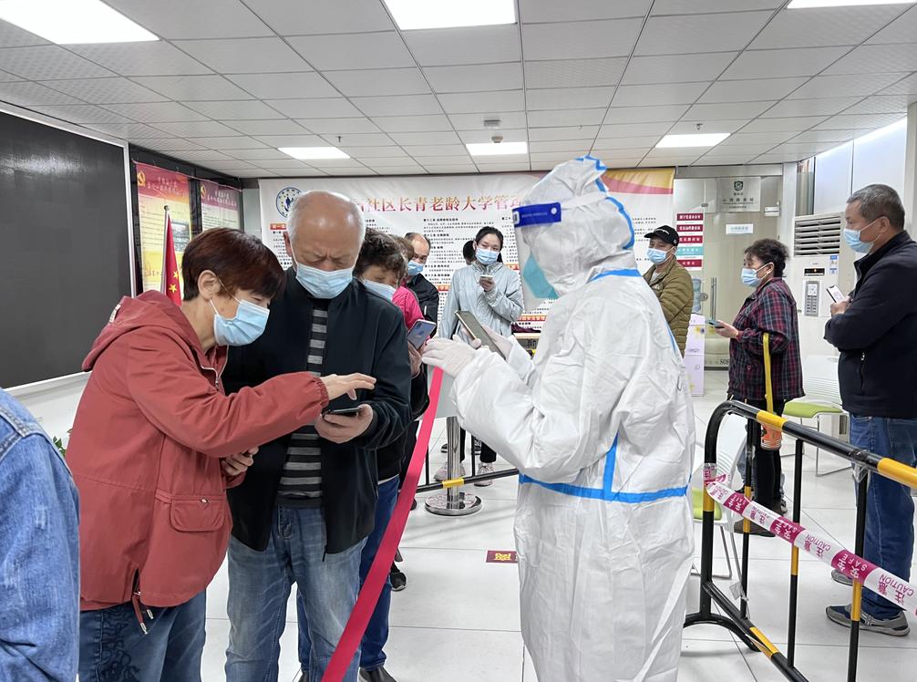寒风下,志愿者有序引导居民排队等候,指导群众事先扫码注册登记,针对不会使用智能机的老人,手把手耐心细致地指导。