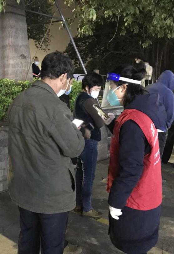 ▲区直挂点教育局科室党员志愿者协助居民扫码填写信息