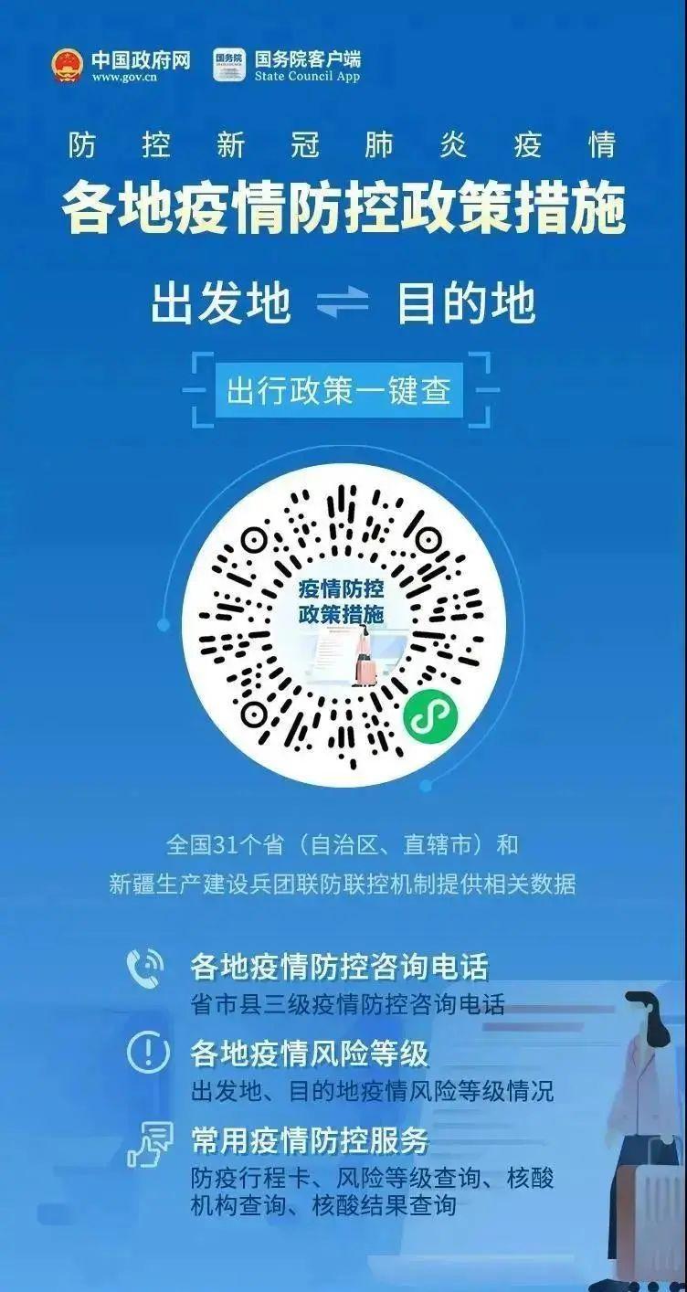 出行前提前了解出发地和目的地城市最新防疫政策要求,做好相关准备,以免影响出行。