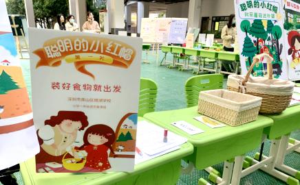 一年级“聪明的小红帽”一共要通过四道关卡:装好食物就出发、我采蘑菇送外婆、智斗狡猾大灰狼、我讲故事给外婆听。