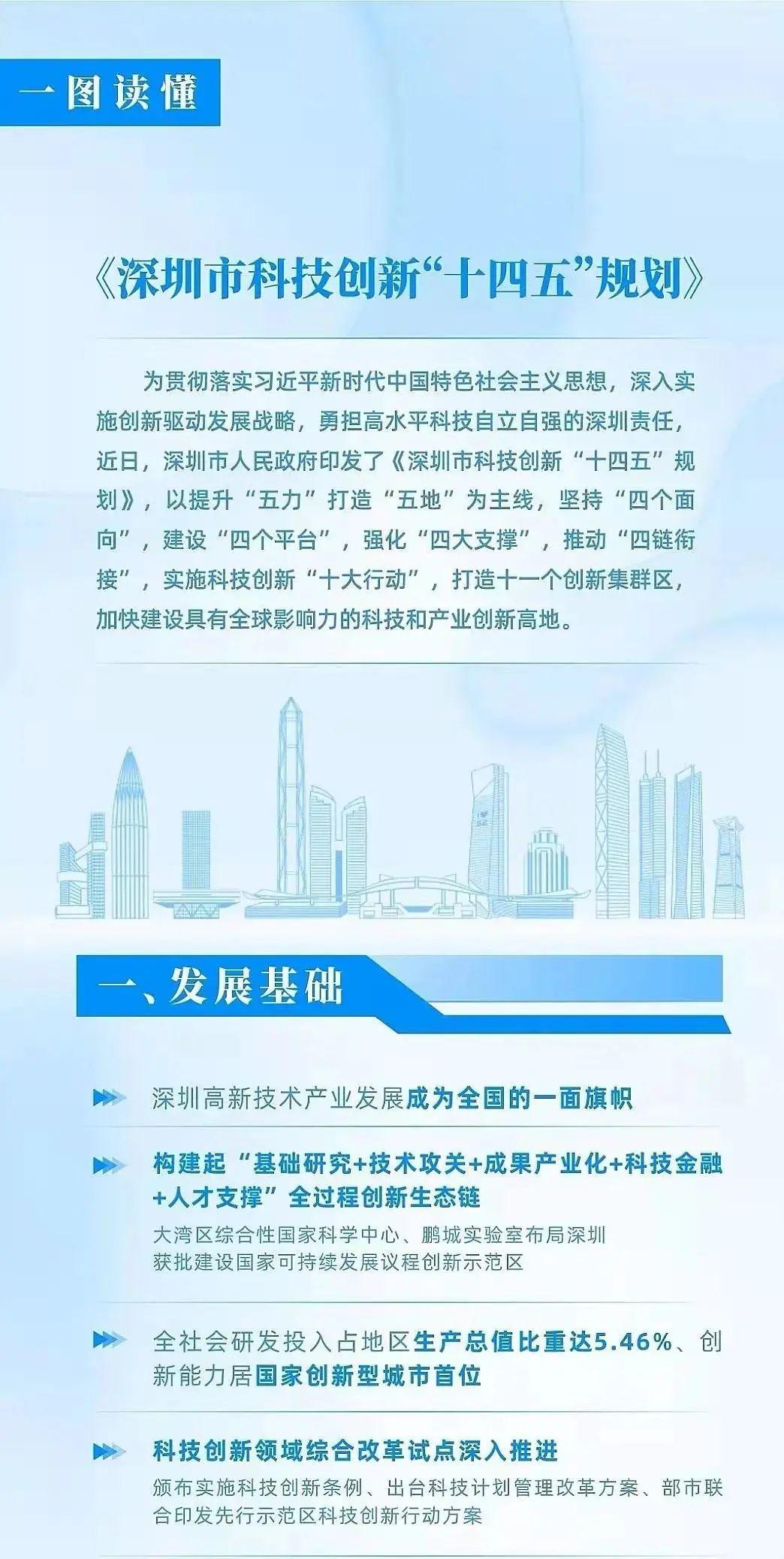 “十四五”时期是深圳全面建成现代化国际化创新型城市的关键时期。日前,深圳市科技创新委员会披露了《深圳市科技创新“十四五”规划》相关内容,进一步明确建设“四个平台”、强化“四大支撑”、实施“十大行动”等“十四五”科技创新主要任务,明确了“20+8”技术主攻方向,即围绕深圳七大战略性新兴产业及20个产业集群和八大未来产业开展技术攻关。