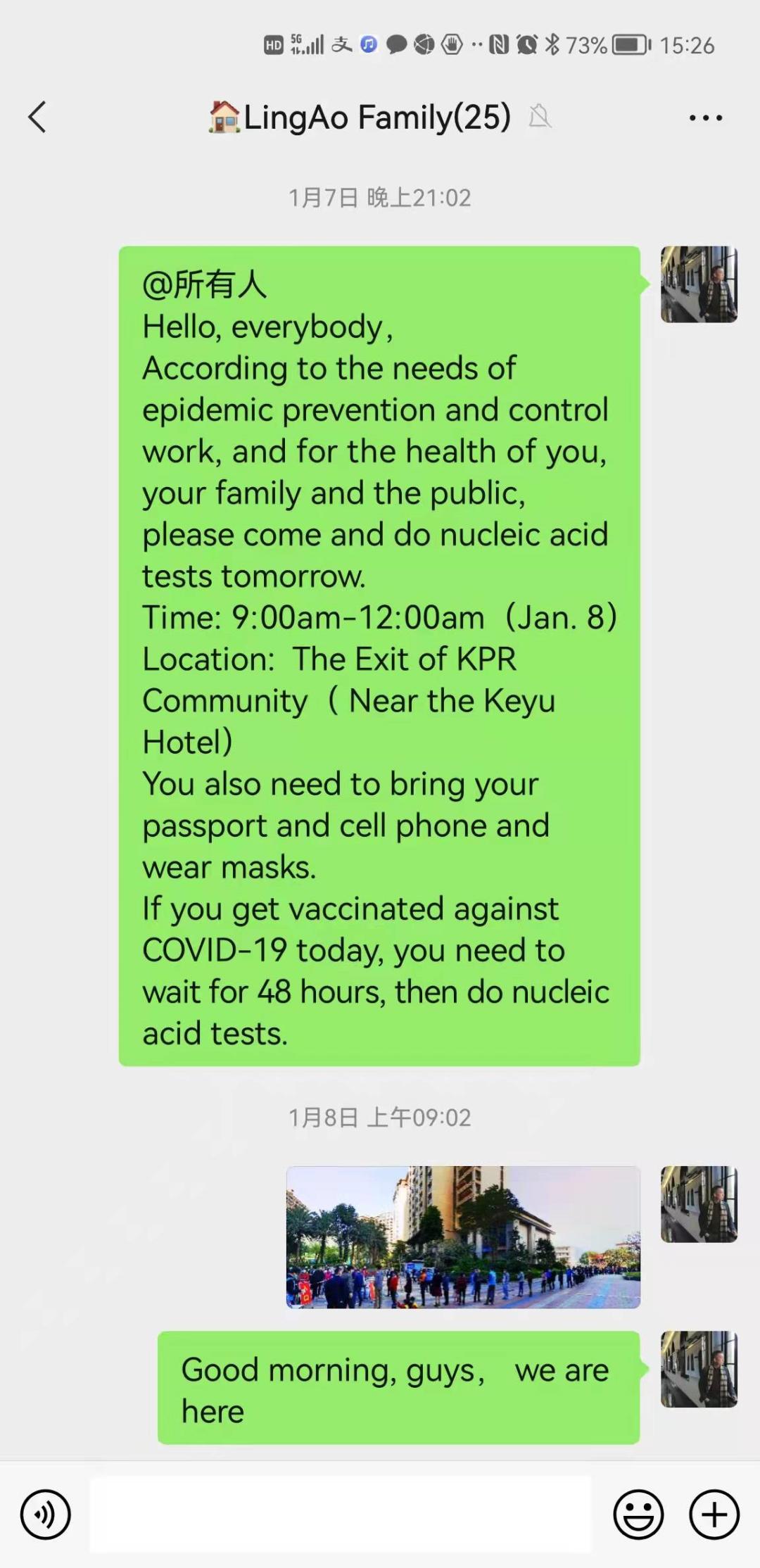 这一次,当他得知社区招募英语志愿者的信息后便立马加入了志愿者队伍,其中就发生了一个小插曲,采样过程中有一个取样瓶不慎被摔破,10人组需重新检测,其中有两位是外籍人员,李翊老师耐心地跟他们电话沟通,请他们返回采样点重新做检测,志愿者们的热心细致得到了外籍人士的连声夸赞。李翊老师说:“作为教师,得到了社会的许多关爱,因此想为社会做点什么,没想到在付出的同时却收获了更多。”