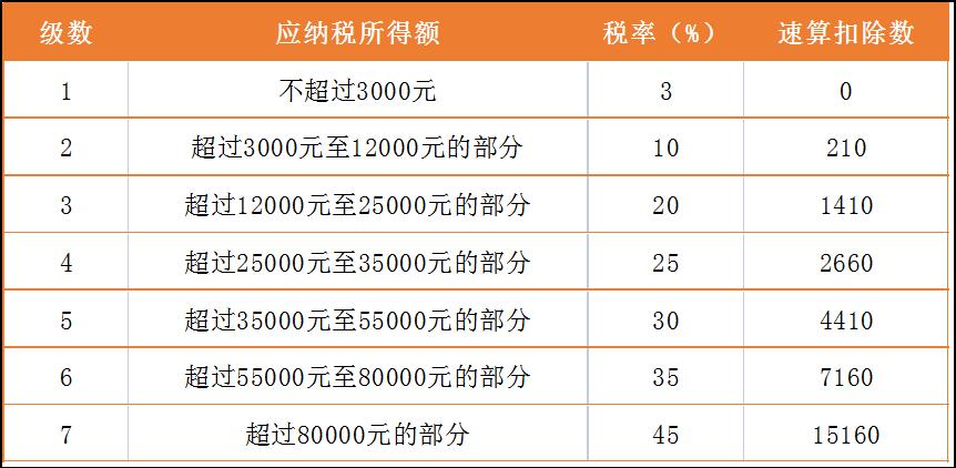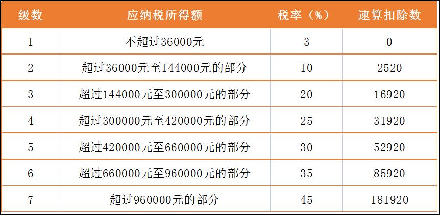 (2)年终奖:240000÷12(月数)=20000,适用按月度税率表(表1),则税额为:240000×20%(表1-级别3-税率)-1410(表1-级别3-速算扣除数)=46590元