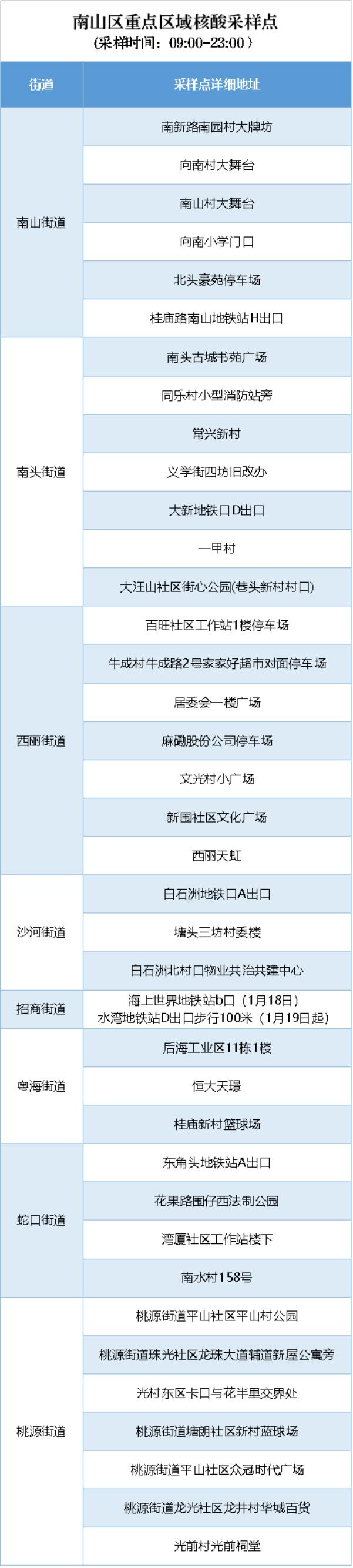 温馨提示:自1月19日起,招商街道的核酸采样点为:水湾地铁站D出口步行100米(水湾1979三栋楼下),其余街道地址不变