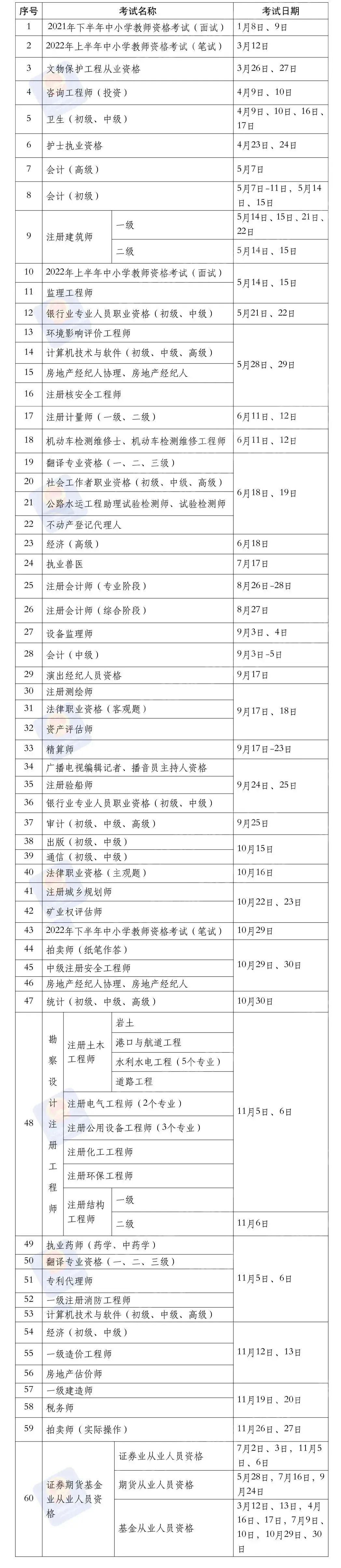 专业技术人员职业资格考试时间表