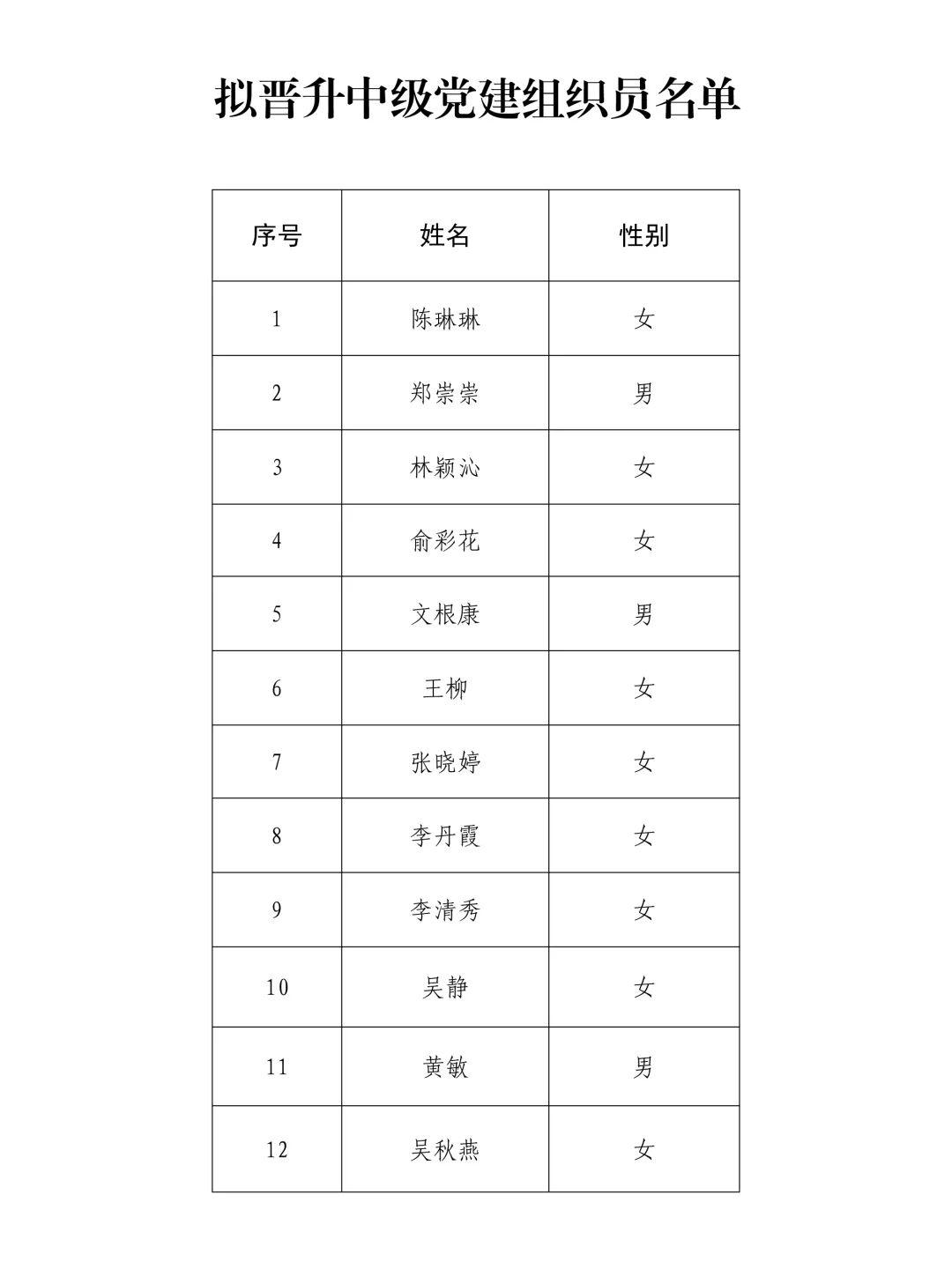 根据《宝安区党建组织员管理办法(试行)》相关规定,开展党建组织员晋级评定工作。经笔试、考察等流程,并经区委组织部部务会审定,陈琳琳等12位同志拟晋升中级。