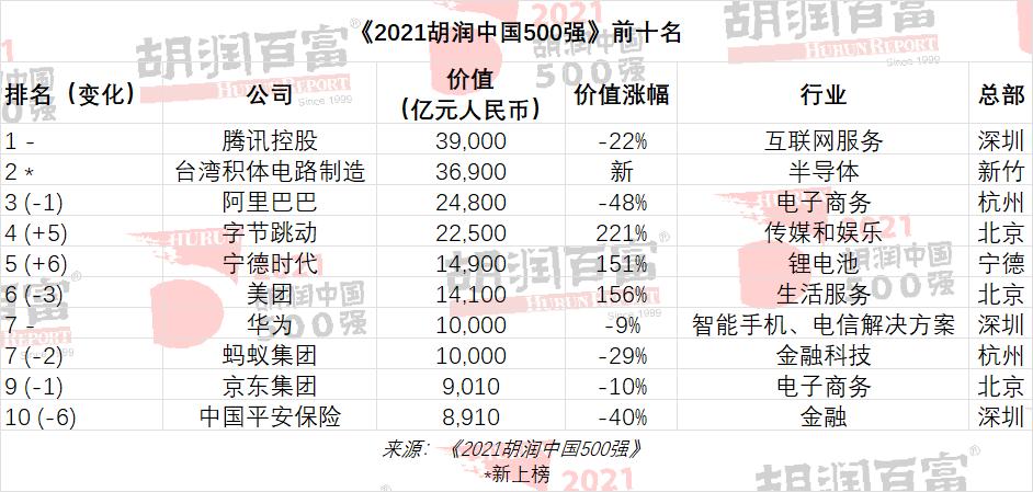 中国500强前10名企业分别是:腾讯、台积电、阿里巴巴、字节跳动、宁德时代、美团、华为、蚂蚁集团、京东、中国平安。前十名总部深圳和北京的最多,各有3家,其次是杭州2家。