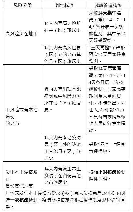 二、强化重点人员管理严格限制中、高风险地区所在地市或防范区人员出行,确需返河的,应提前3天向所在单位、目的地社区居委会或村委会报备,且须持48小时内核酸阴性证明,并按规定配合做好核酸检测和相应的管控措施(集中隔离、居家隔离、居家健康监测或自我健康监测,下同)。境外入境集中隔离解除后不满14天的人员,返河后应立即向居住酒店、所在单位、目的地社区居委会或村委会报备,并按规定配合做好核酸检测和相应的管控措施。高风险岗位人员(如,收治新冠肺炎及隔离人员的定点医院医务人员、集中隔离场所工作人员、在陆港空口岸接触入境人员和进口货物的人员等)尽量避免出行,确需返河或回乡的,须脱离工作岗位14天以上且持48小时内核酸阴性证明,并提前3天向所在单位、目的地社区居委会或村委会报备。需要定期核酸检测岗位的人员(如,从事进口冷冻食品销售、医疗机构医护人员、“三点一线”人员等)尽量留在当地过节,确需返河或回乡的,须提前3天向所在单位、目的地社区居委会或村委会报备,且持48小时内核酸阴性证明,返河或回乡后按原来的频次进行核酸检测。