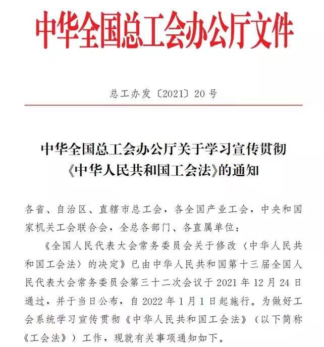 2021年12月24日,《全国人民代表大会常务委员会关于修改<中华人民共和国工会法>的决定》已由中华人民共和国第十三届全国人民代表大会常务委员会第三十二次会议于2021年12月24日通过,自2022年1月1日起施行。
