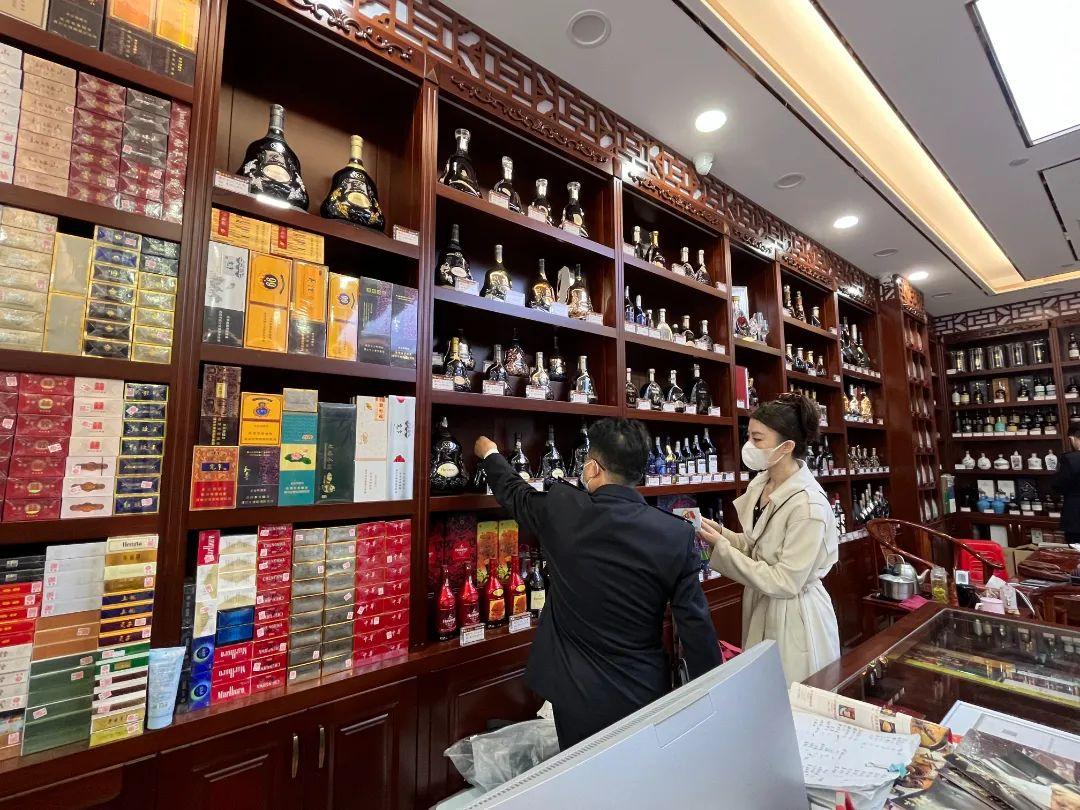 △执法人员进入该酒行进行检查,店内的酒类产品一览