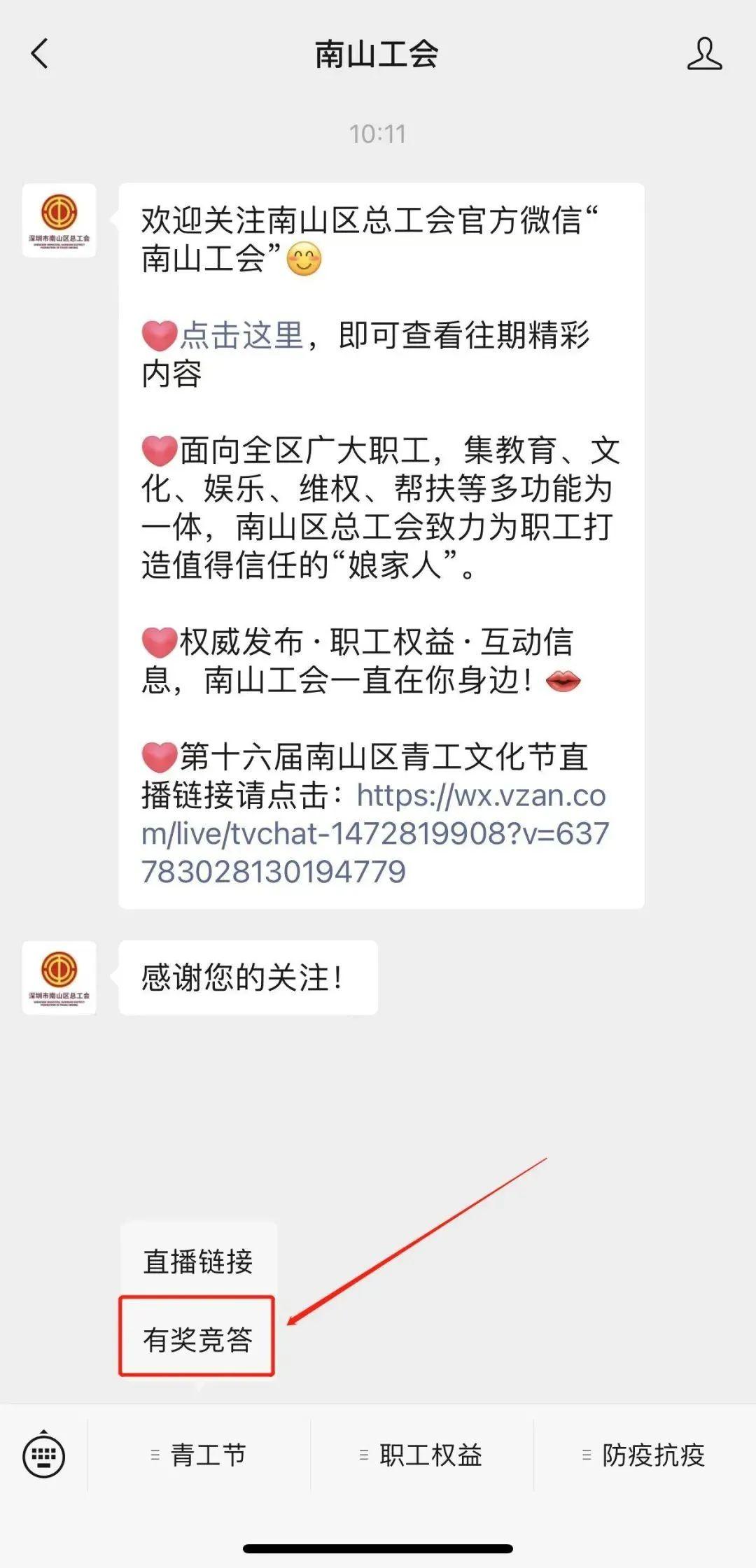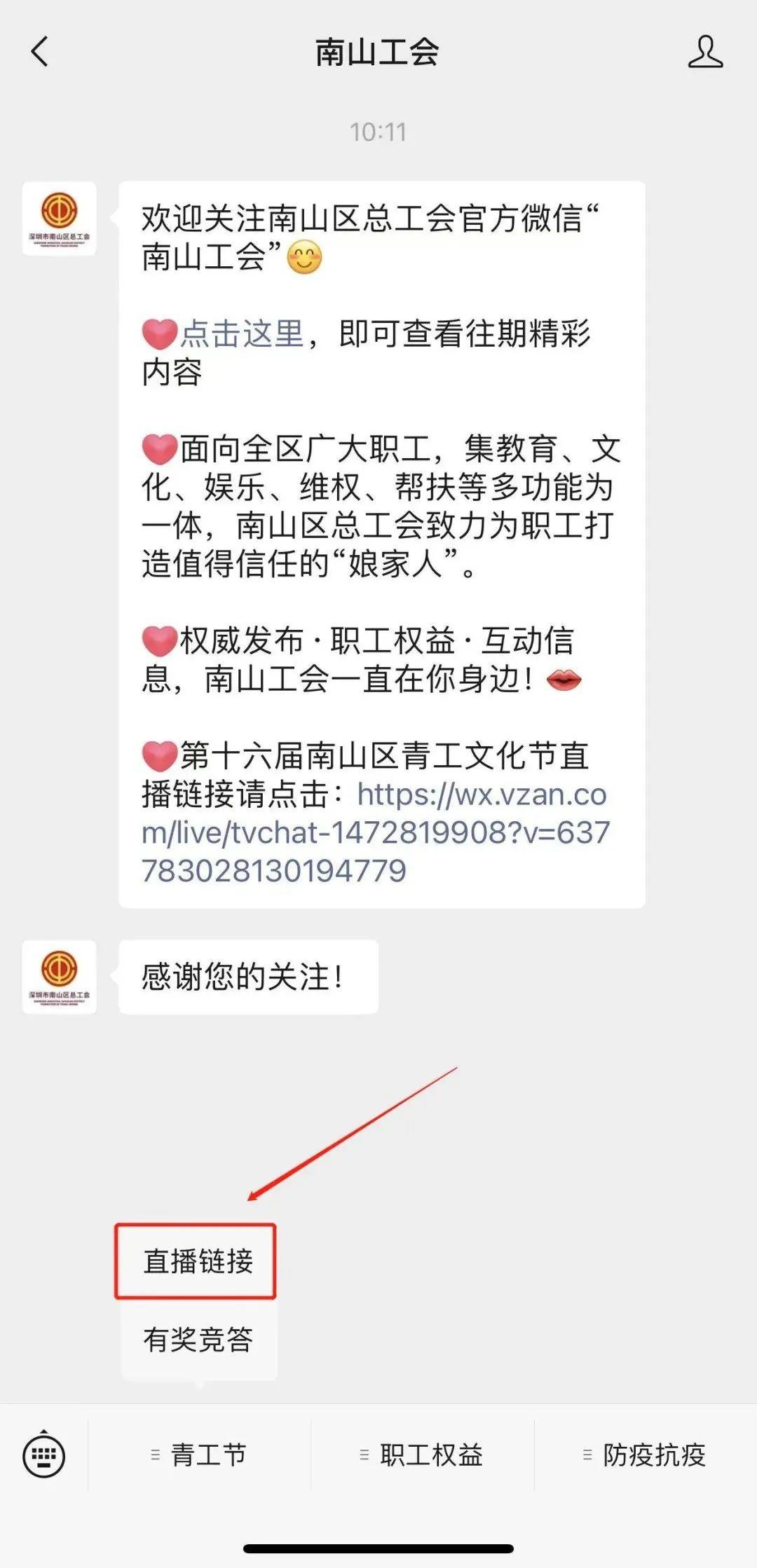 南山区第十六届青工文化节启动仪式今天下午15:00正式开启南工君已经迫不及待迎接这场“云端party”了。直播现场精彩不断直播现场不仅有大家期盼已久的第十六届青工文化节的启动仪式和2021年度“十大优秀青工”颁奖环节还有来自南山区各个企业带来的精彩节目小伙伴们快来围观吧~活动时间1月21日下午15:00参与方式Step1关注“南山工会”微信公众号Step2点击菜单栏-青工节-直播链接即可进入直播参与互动好礼不停观看直播期间区总工会将隆重推出“学理论、促发展、作贡献”有奖知识问答活动答题赢话费、华为手环等好礼。参与方式方式一Step1关注“南山工会”微信公众号Step2点击菜单栏-青工节-有奖竞答即可进入答题页面方式二后台回复关键词【答题】即可进入答题页面还等什么
