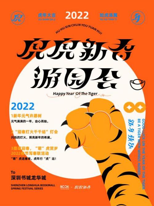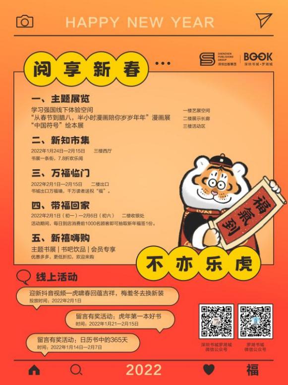 值得一提的是,大年初一至初六期间,“名校校长讲堂”新春特别场、“历史人文讲堂”、“福田演说家”新春表演秀、“深圳晚八点艺术时空——如何布置家居新春氛围?”“深圳晚八点——追影的人”等精彩纷呈的文化活动将于中心书城南、北大台阶轮番上演,邀请名家大咖莅临书城,与读者在书中品味幸福;推出“礼”遇2022虎年新春礼品展台,组合名家签名书、新春图书套装、文创精品、虎年“书酒礼盒”套装、“如虎添翼”福袋等新春礼品,献上满满的新年祝福;书城各店、书吧、水吧准备了“新春限量福袋”“集福攻略”“集福游戏”“绘本借阅岛”借阅服务、“新春作业进击营”等惊喜福利,让市民读者度过一个“生龙活虎”的新年。