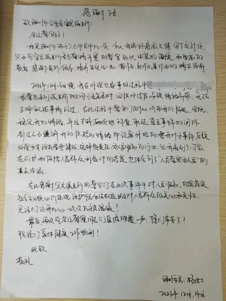 2021年12月14日,当事人杨女士特意手写了一封心意满满的感谢信送到宝民派出所,以表示对宝安警方“全心全意为群众办实事”的谢意。