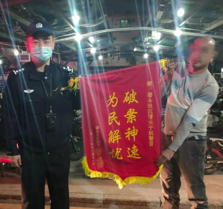 故事要从2个月前说起:去年11月13日凌晨3时许,王先生报警称电动车不见了。接警后,于航连夜展开侦查研判,数小时后顺利帮王先生找回爱车。为表感谢,王先生专程制作了面锦旗准备送给于航。