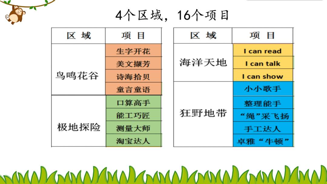 活动划分“鸟鸣花谷”、“极地探险”、“海洋天地”和“狂野地带”四块区域,分别对应语文、数学、英语和综合科目,共计16个活动项目,充分调动孩子们的口、手、脑、眼等多感官能力。