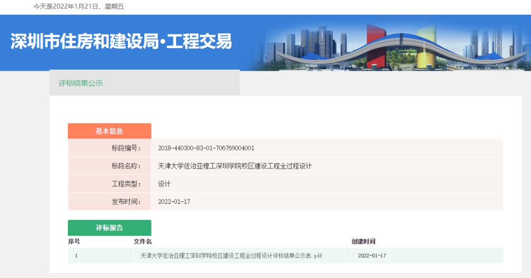 On January 14, 2022, the evaluation meeting of the Whole Process Design of the Campus Construction Project of Georgia Tech Shenzhen Institute Tianjin University (project number: 2018-440300-83-01-706769004) was held at the conference room of JW Marriott Shenzhen via on-site meeting + teleconferencing. The bid evaluation results have been announced on the website of Shenzhen Construction Project Trading Service Network.