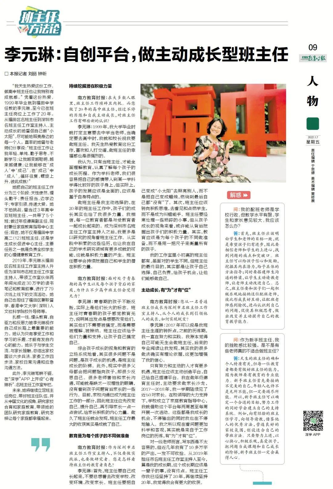 此外,李元琳笔耕不辍,在“深学”APP上开设“心有琳析”、名班主任工作室专栏。