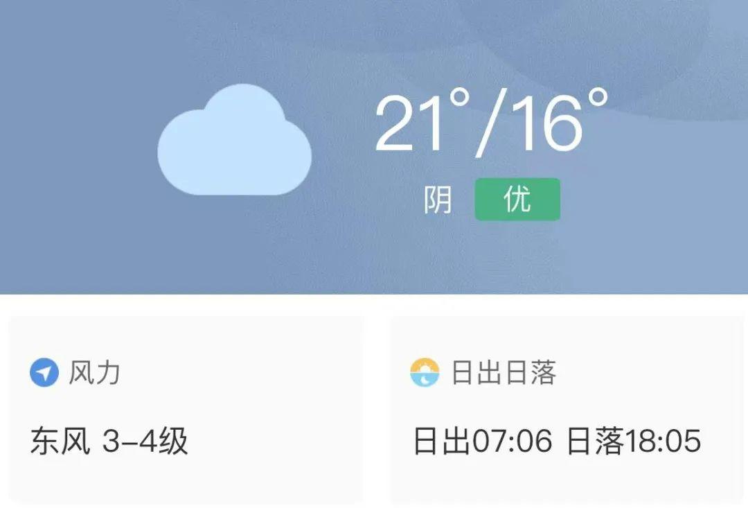 22日,阴天间多云,有零星小雨,早晚有轻雾;16-21℃;东风3-4级,阵风6级;相对湿度75%-95%。