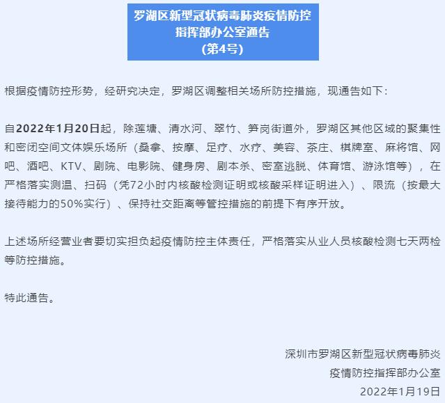 1月19日晚,罗湖区新冠肺炎疫情防控指挥部办公室发布通告,根据疫情防控形势,经研究决定,罗湖区调整相关场所防控措施。