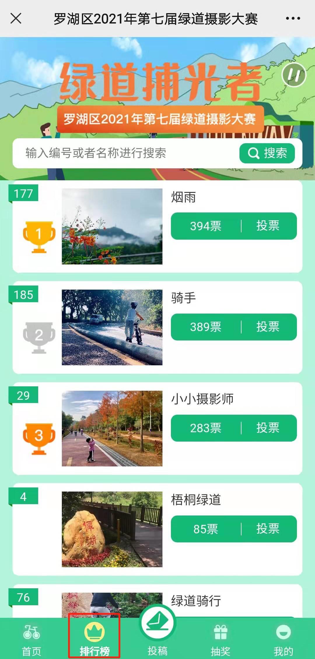 进入投票活动页面后,点击右下角“续写绿道故事”,在首页或排行榜处为参赛作品投票。
