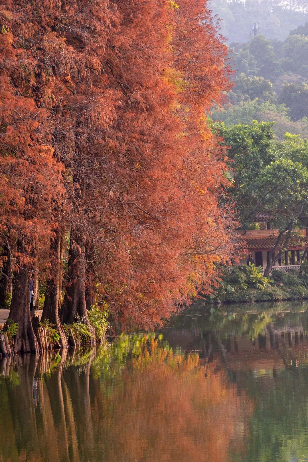 红黄相间的杉树倒映于湖水中