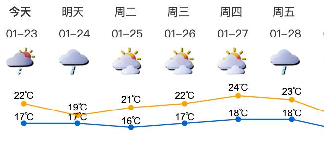 深圳未来10天雨雾天气增多,除夕前有明显降温。23-24日,受弱冷空气影响,粤北和珠江三角洲北部市县有中到大雨,气温略降;雨雾天气能见度差;25-27日多云到阴天,气温略回升;28-30日受冷空气影响,有降雨降温过程,其中28-29日有小雨,30 日气温明显下降,最低气温11-12℃。
