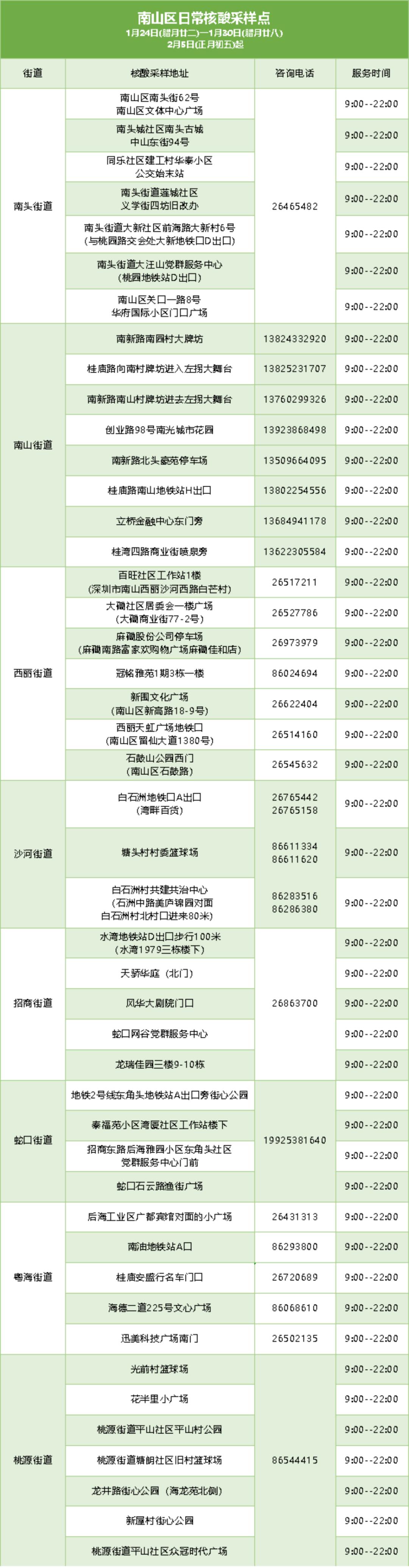 南山区设置了以下核酸检测采样点