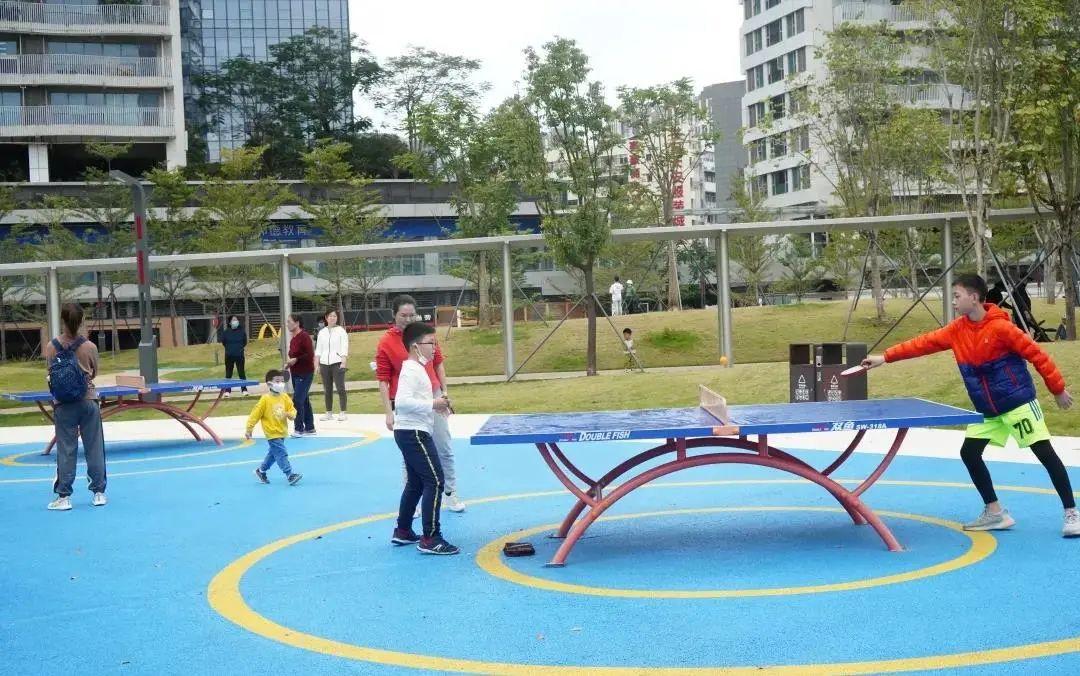 公园靠近来福士广场,人气十足,不少市民在公园跑步、锻炼身体,小朋友们在儿童乐园玩耍。