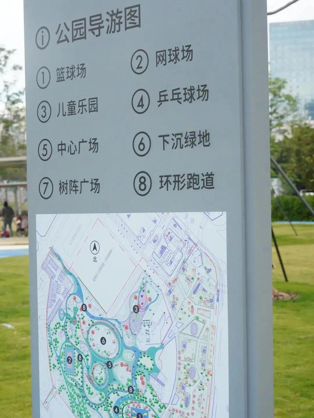 公园导游图显示,南海公园二期建有下沉绿地、树阵广场、环形跑道、儿童乐园、篮球场、网球场、乒乓球场等8大活动空间和特色景观。