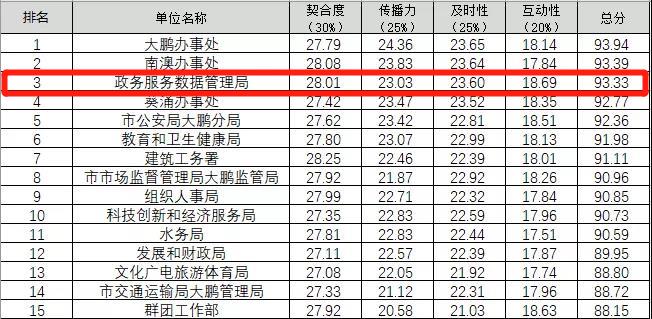 大鹏新区政务服务数据管理局总体分数紧追其后,推出各类“线上+线下”活动,着力加强与市民之间的沟通与交流,在“互动性”上位居榜首;充分利用各网络平台发布新闻,报道紧贴时事热点,面对网友的留言回复积极及时,持续向群众介绍对于新行政服务大厅的具体服务范围,加深便民服务的理念,在“契合度”和“及时性”上同样名列前茅。