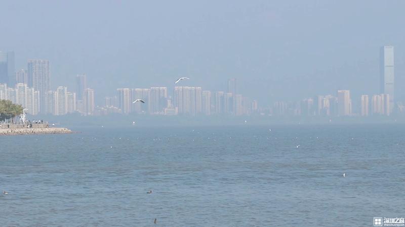 深圳湾畔,一群海鸥于海上翩翩起舞,直飞向海岸线边而去,飞的低时甚至能听到羽翼煽动的声音。