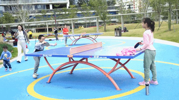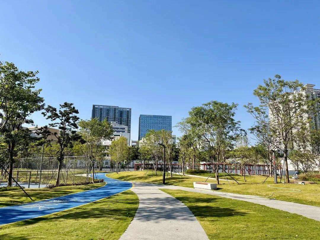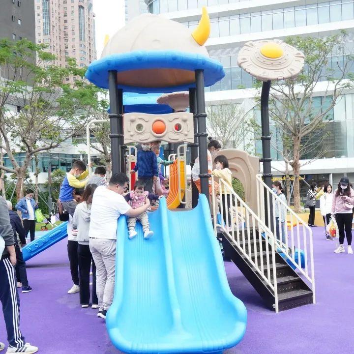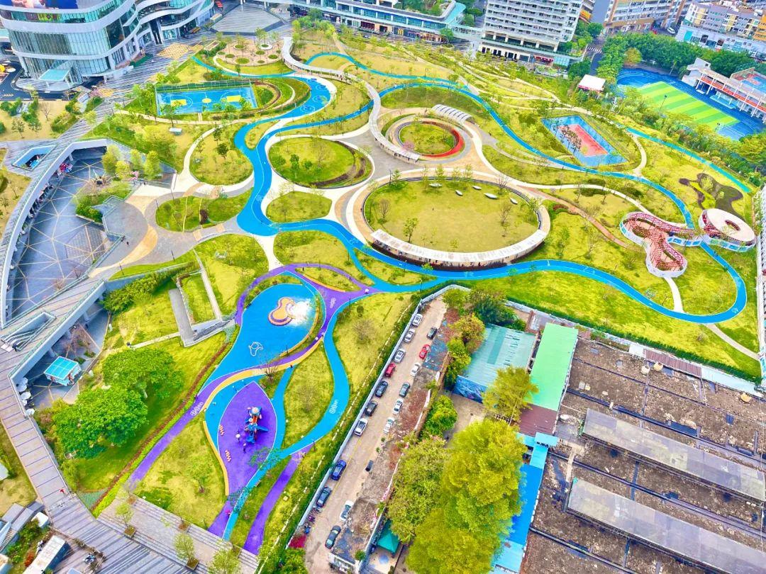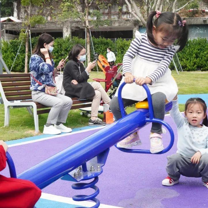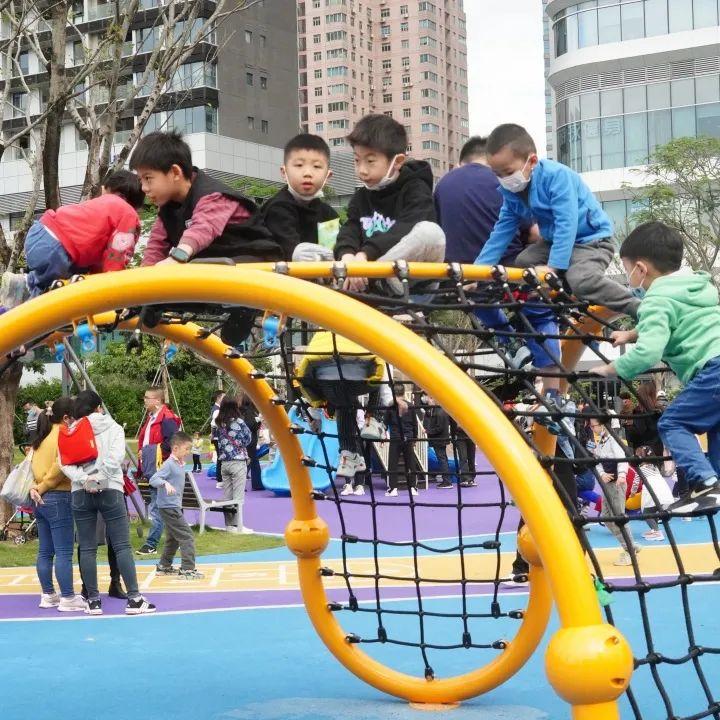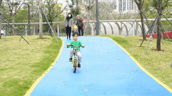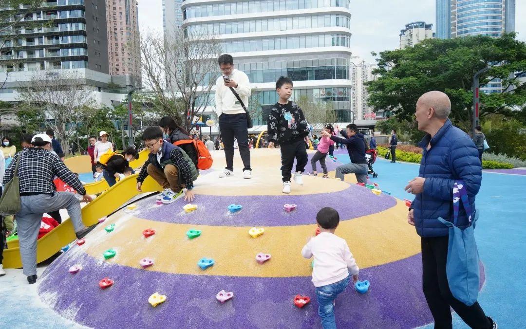 公园靠近来福士广场,人气十足,不少市民在公园跑步、锻炼身体,小朋友们在儿童乐园玩耍。