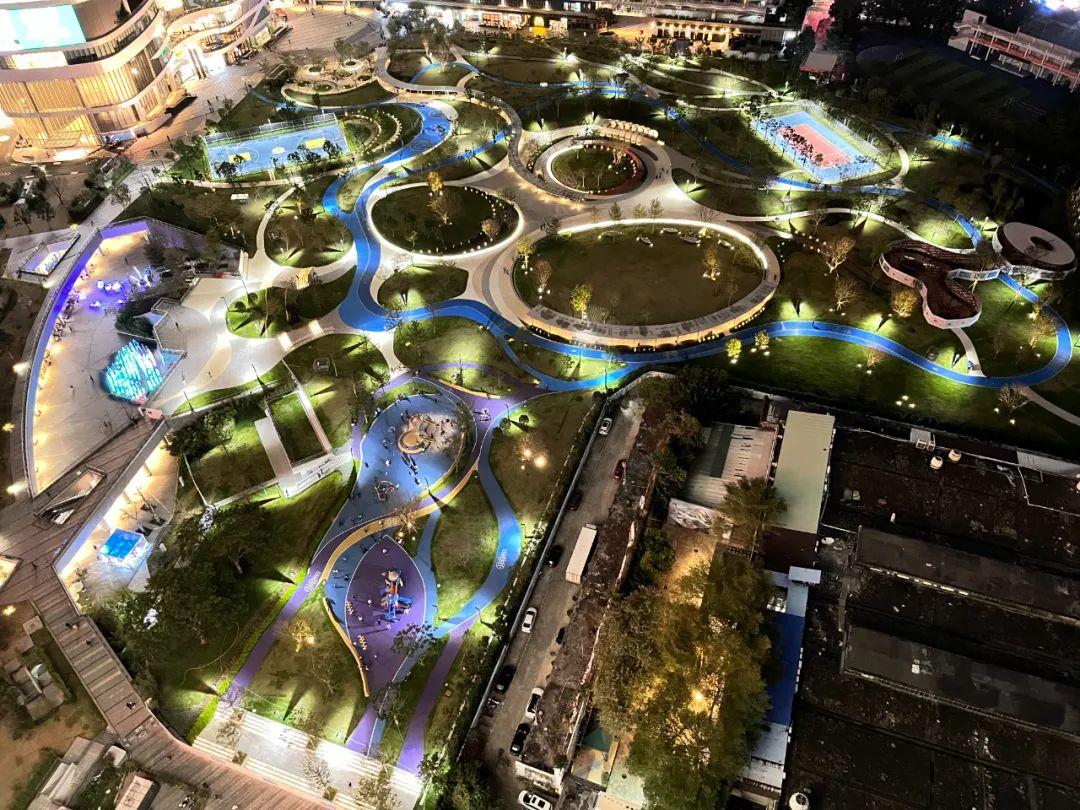据悉,整体景观结构为“一心、一环、以运动休闲为主的多功能分区”,即以中心活动区为核心,环形跑步道串联外围多个功能区,从四面入口向中心汇集;跑道地面更是采用荧光点缀,公园夜景犹如星辰大海,呈现出城市与星空之美。