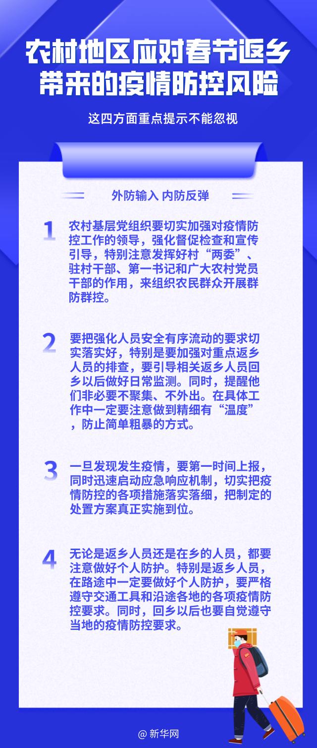 春节将至,农村地区的外出务工、上学人员集中返乡,如何降低流动人员带来的疫情传播风险?春节期间农民朋友走亲访友、举办酒席,在疫情防控方面有哪些提醒?来听专家怎么说。
