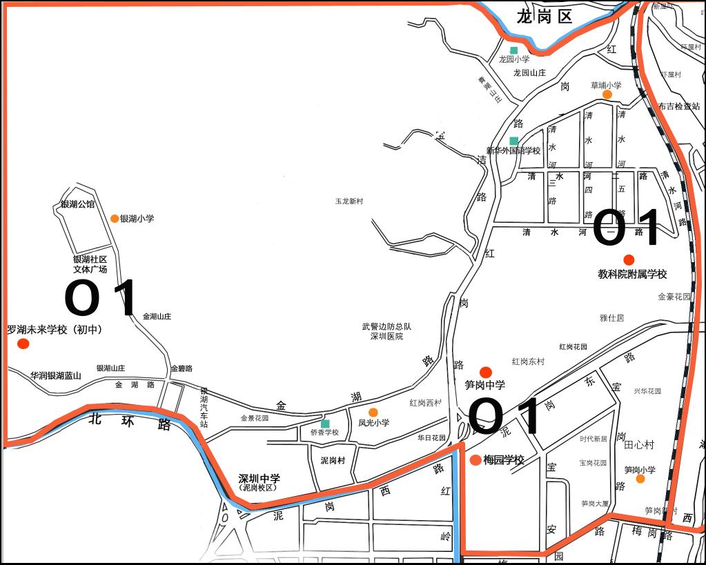 ◆01大学区由罗湖未来学校小学部、凤光小学、银湖小学等3所学校组成,保留现01大学区范围不变。