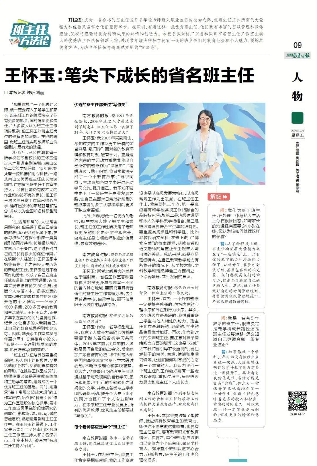 王怀玉:我2005年来到南山,深知过去的工作经历中所谓的荣誉只是“敲门砖”,面对新的教育环境和教育对象,唯有学习。正是这种内在的学习动力激励着我以自己所带的班级作为“试验田”,“精耕班级”,勤于积累,将日常做法变成了一个个教育故事;“寻求同盟”,主动参加各类学术研讨活动学习交流,提升自己。我不知不觉中走上了一条班主任专业发展之路,让自己在面对日常琐碎纷繁的班级事务时多了从容和平和,更多了职业幸福感。