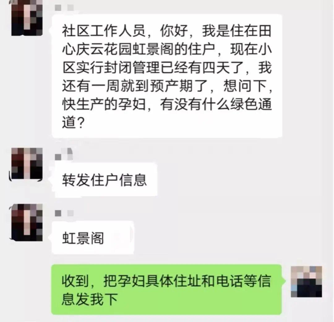 1月14日晚,在田心社区疫情防控群中,一条信息引起了工作人员的关注:“社区人员你好,我是田心庆云花园虹景阁的住户,现在小区实行封闭管理已有四天了,我还有一周就到预产期了,想问下,快生产的孕妇有没有什么绿色通道?”