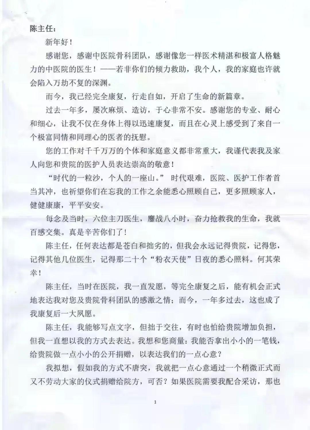 “ 感谢您,感谢中医院骨科团队!感谢像您一样医术精湛和极富人格魅力的中医院的医生!若非你们的倾力相助,我个人,我的家庭也许就会陷入万劫不复的深渊。而今,我已经完全康复,行走自如,开启了人生的新篇章。”