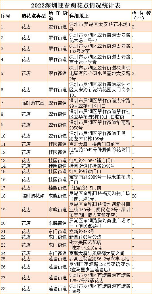 全区5个街道设置28个分散购花点。其中,东晓街道金稻田路福安购物广场购花点规模较大,共有27个档位;其余购花点大多为花店或临时便民设置。各购花点均张贴“2022年深圳迎春购花点”统一标识。