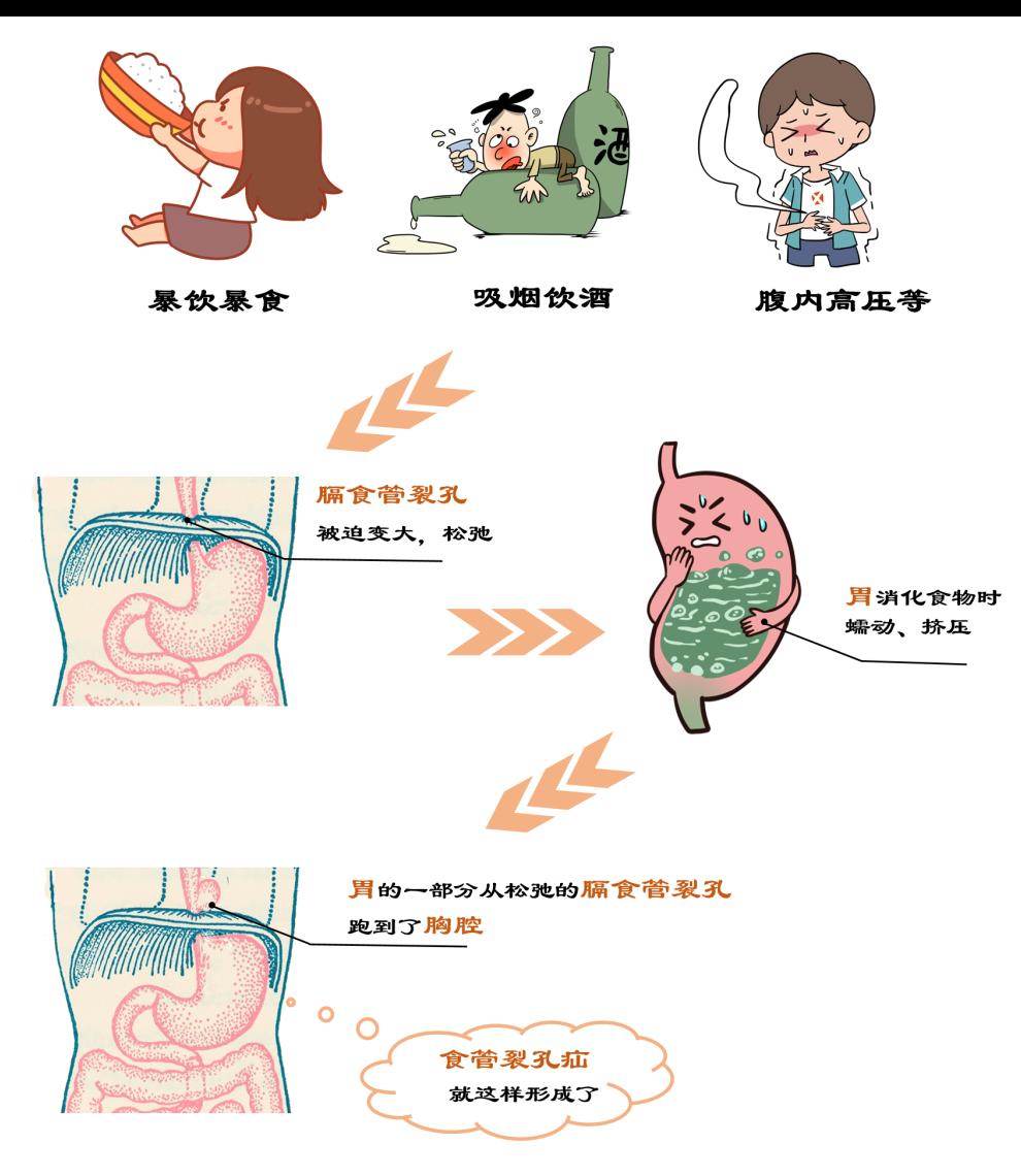 胸骨后烧灼样痛,反流返酸,打嗝和反胃,吞咽障碍甚至上消化道出血,如果食管裂孔疝较大,患者会出现胸闷、气短、压迫、腹胀、恶心、呕吐、剧烈腹痛、贫血。