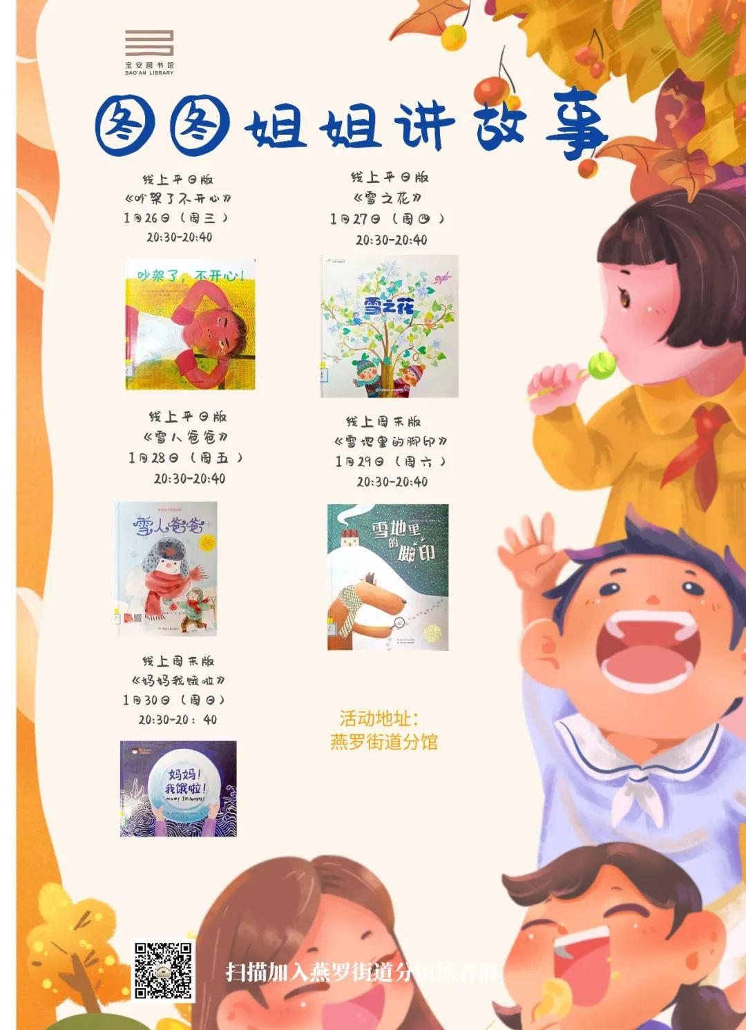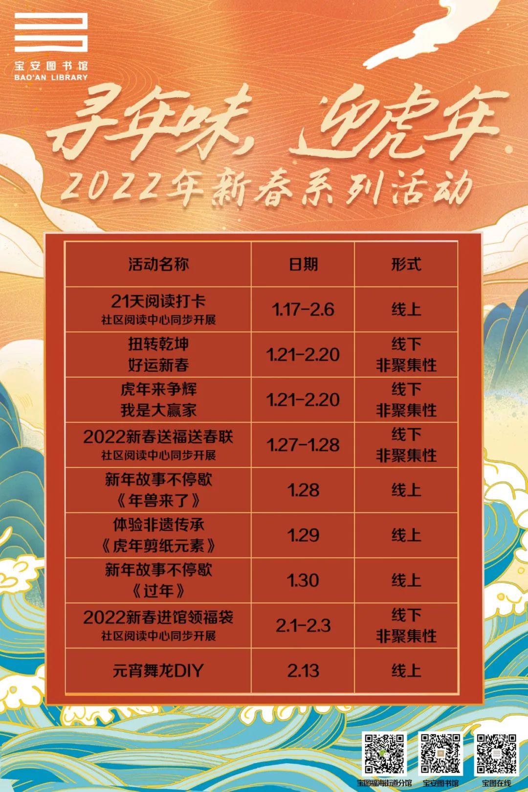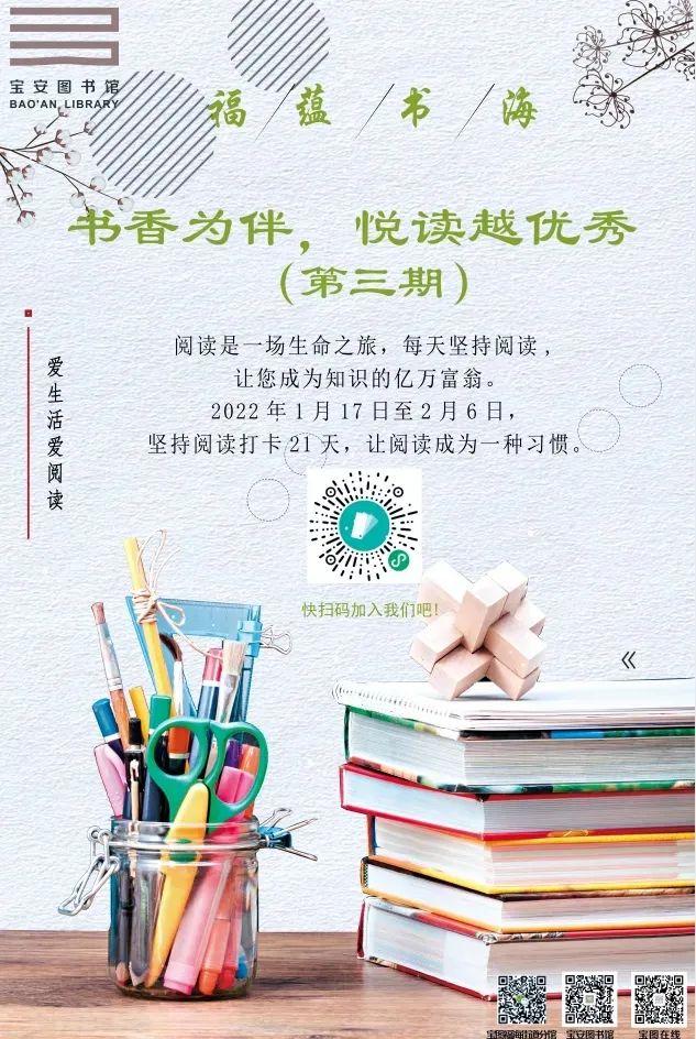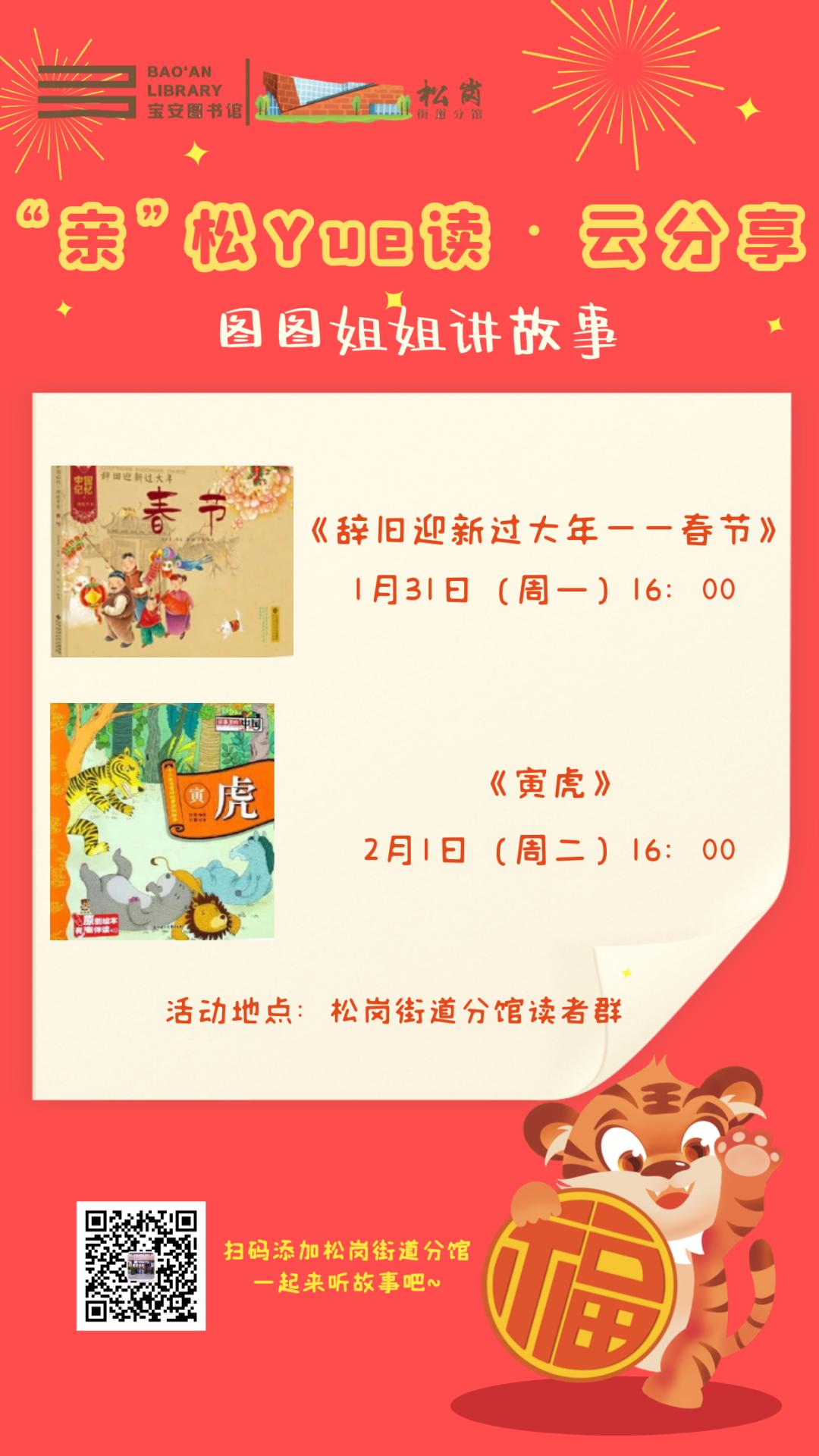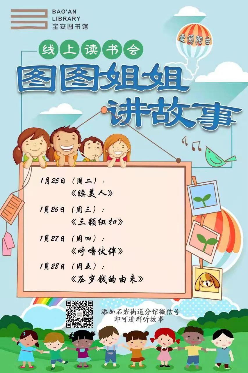 近期活动预告2022.1.26-1.31松岗街道分馆 “亲”松Yue读·云分享 图图姐姐讲故事(线上)福海街道分馆 图图姐姐讲故事扭转乾坤,好运新春虎年来争辉,我是大赢家“书香为伴·悦读越优秀”线上阅读打卡“寻年味,迎虎年”2022年新春系列活动福永街道分馆 图图姐姐讲故事(云故事)阅享福永·话说传统(老话说得好)石岩街道分馆 图图姐姐讲故事(线上读书会)爱阅阳台有本书爱阅阳台·古诗手势舞(线上)集印章·换好礼西乡街道分馆 喜阅西乡——听故事·识英文(线上)喜阅西乡——相约故事之旅(线上)燕罗街道分馆 图图姐姐讲故事松岗街道分馆01▽02▽编辑 郭贝贝审核 叶雨萌福海街道分馆01▽02▽03▽04▽05▽编辑 钟凯宁黄婷徐少丽审核 徐少丽福永街道分馆01▽02▽编辑人 魏玲娜审核人 曹婷石岩街道分馆01▽02▽03▽04▽编辑人 叶素清审核人 周龙军西乡街道分馆01▽02▽03▽04▽05▽06▽编辑人 康恺审核人 肖梦怡燕罗街道分馆01▽编辑人 朱菲审核人 曾静