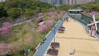 春天的脚步临近,深圳天气逐渐转暖。中心河两岸一排排紫花风铃木绚烂绽放,形成了一河碧水、两岸花开的美丽盛景。不少市民来此打卡游玩,学生在沙滩上玩起了沙滩排球,尽情享受着公园美景。