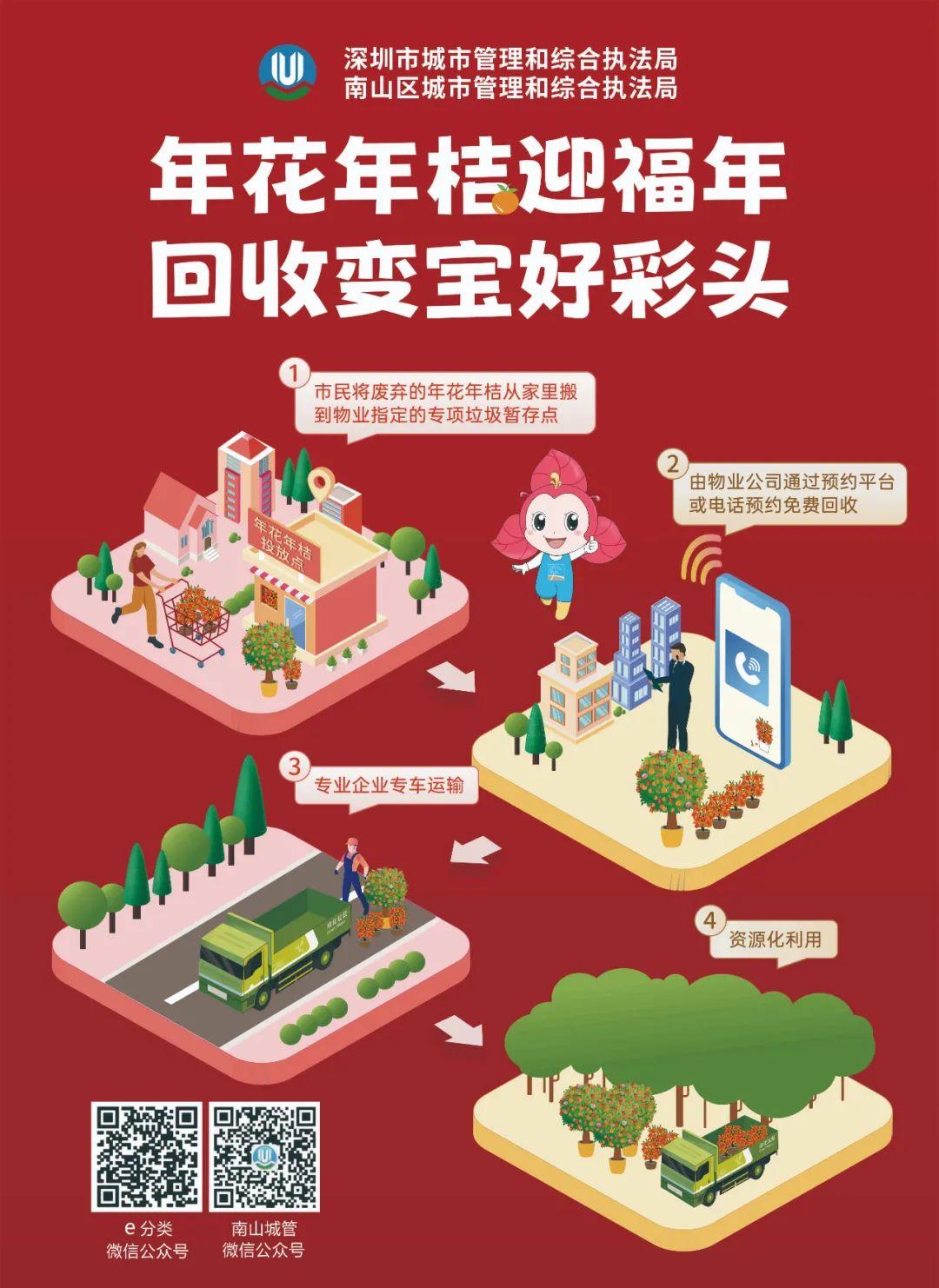 近期南山启动开展2022年南山区废弃年花年桔回收处理工作。本项工作按照“年花年桔源头产生(家庭、单位)——街道、小区物业设置的收集点——小区物业定时定点、电话预约、“e分类”APP等不同方式进行预约收运——分拣回收利用场所”的流程,对废弃年花年桔进行精细化回收和资源化处理利用。