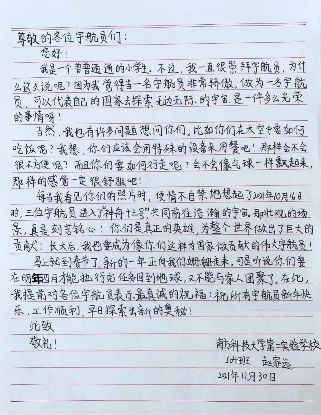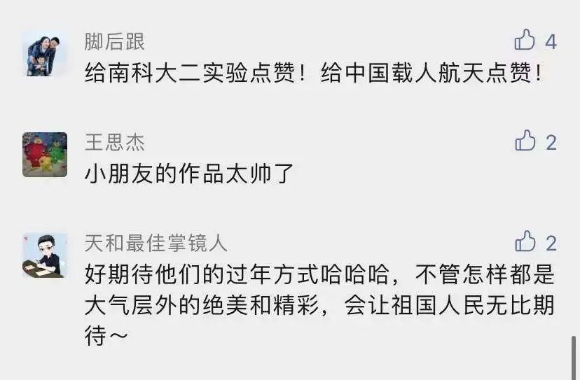 在中国载人航天官微,南科大二实验校长唐晓勇留言说:“这是我们南科大第二实验孩子们的真心祝福!期待航天员完成任务后能来我们学校给孩子们讲讲太空故事。”