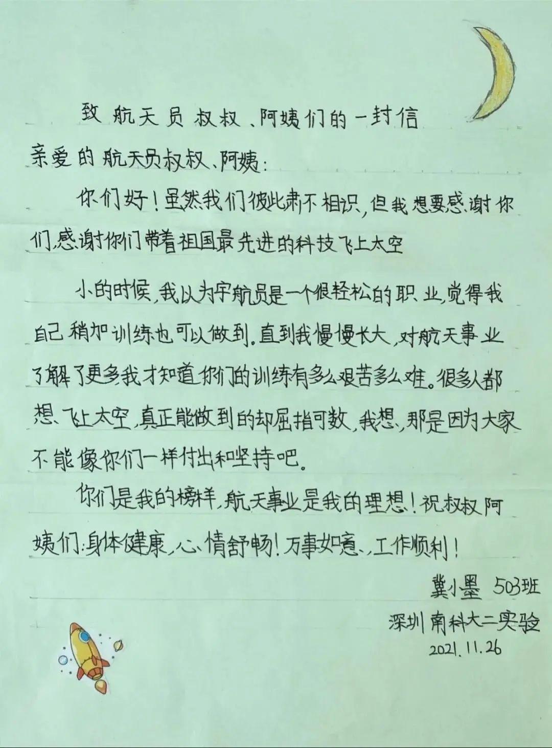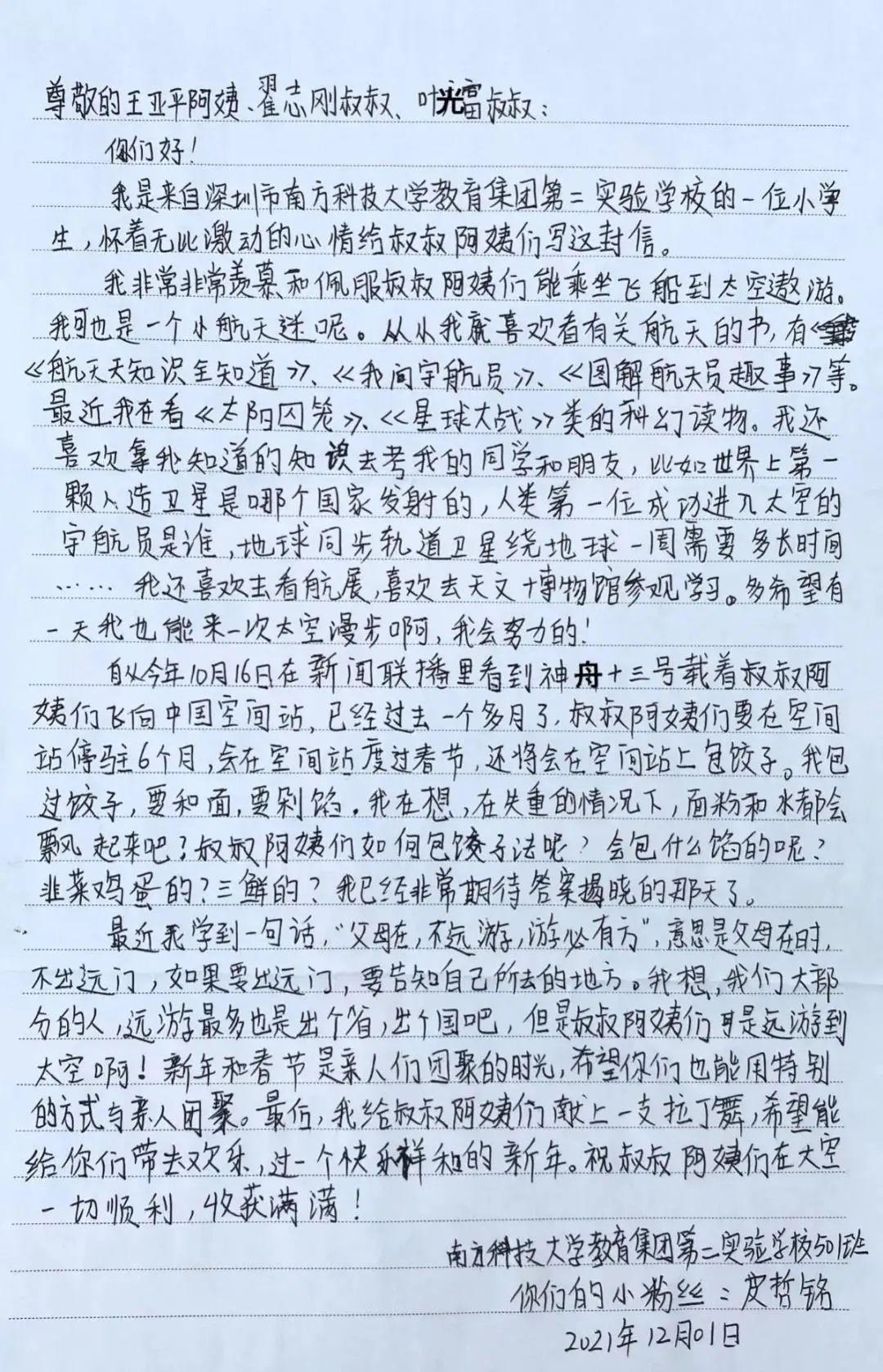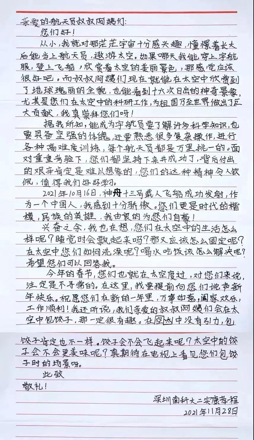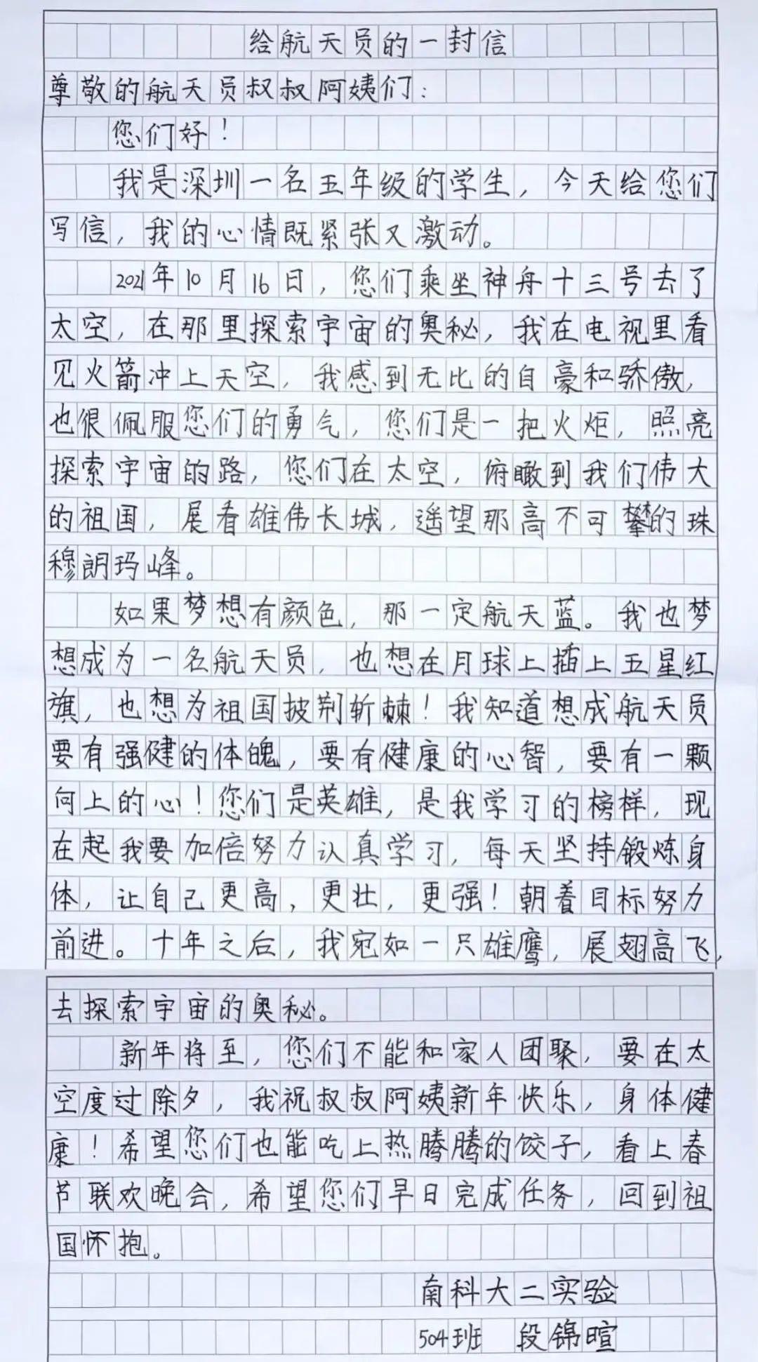 1月24日,“中国载人航天”官方微信公众号刊登南方科技大学第二实验学校(简称“南科大二实验”)学生投递的作品。