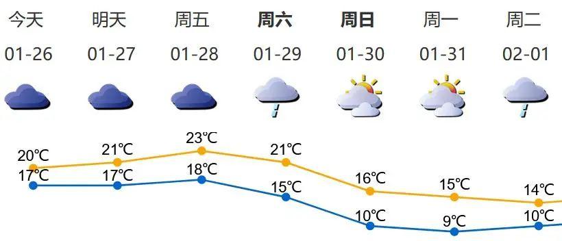 27-28日阴天间多云,早晚有轻雾,气温小幅回升;