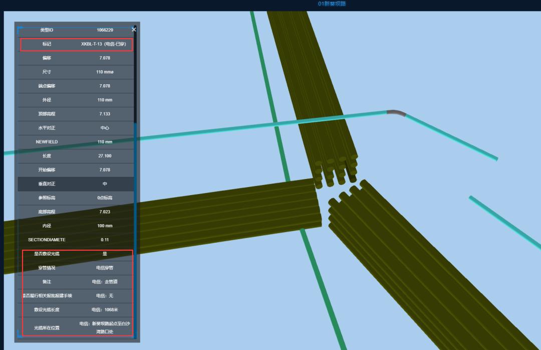 坝光各路网地下通讯管线约有12-18根不等,为避免各通讯公司随意穿管导致分配不合理、穿管信息不清晰等情况。坝光片区借助BIM模型三维可视化的优势,在道路模型中提前对各通讯管线进行编码,并事先统筹规划分配给各运营商。